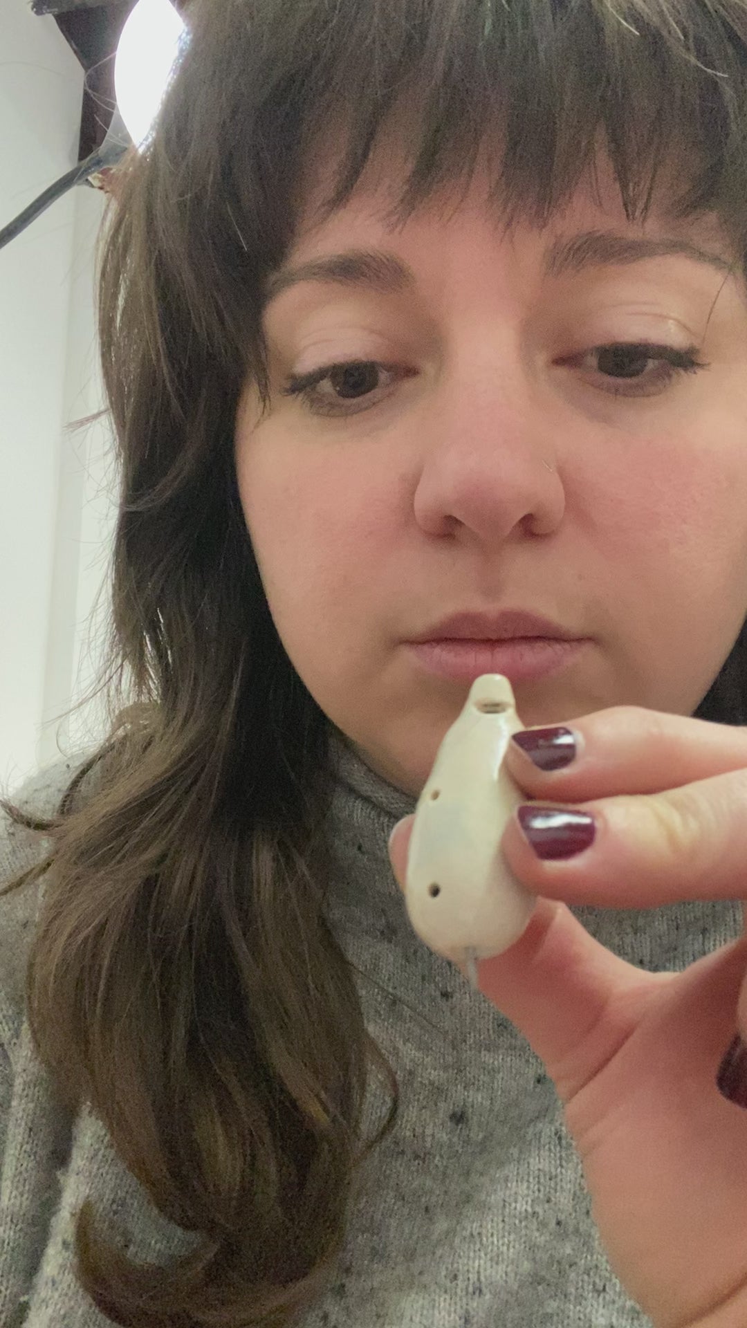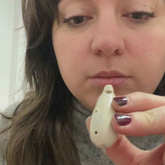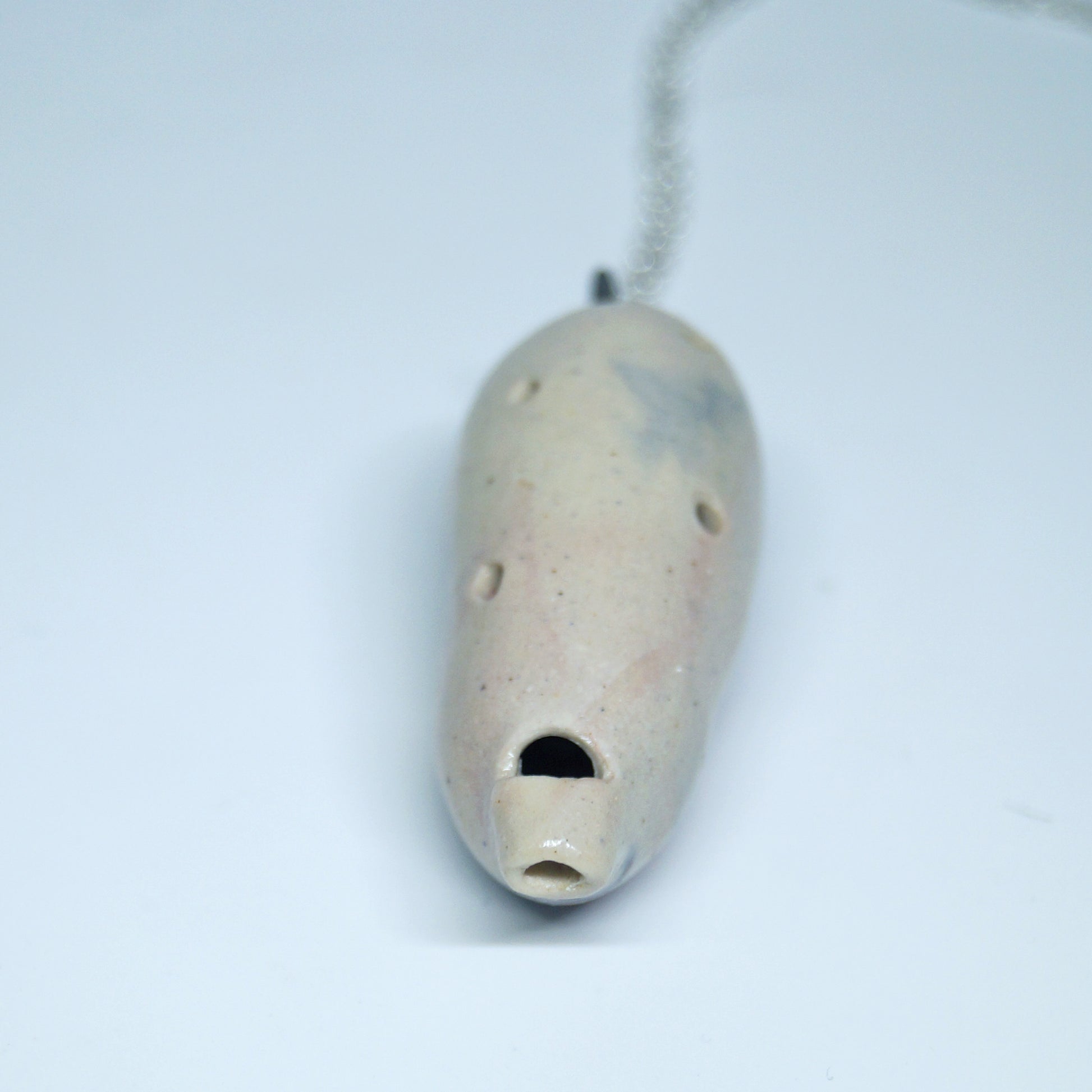 Porcelain flute pendant with red and blue marbling and clear glaze. Includes 24" stainless steel chain.