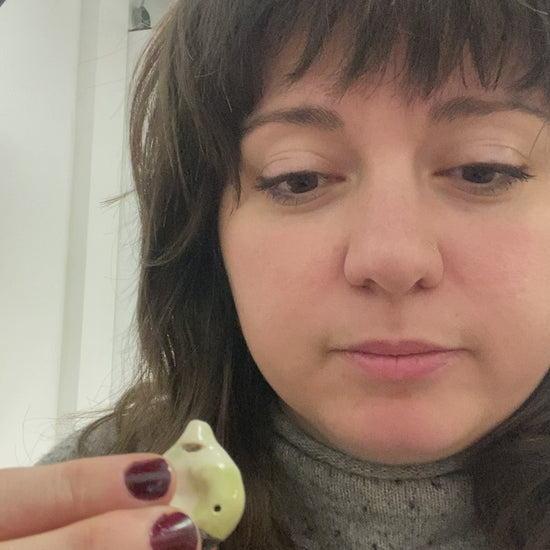 Porcelain flute pendant with yellow marbling and metallic finish. Form is round with a dimple on each side, perfect for fidgeting. Includes 24" stainless steel chain.