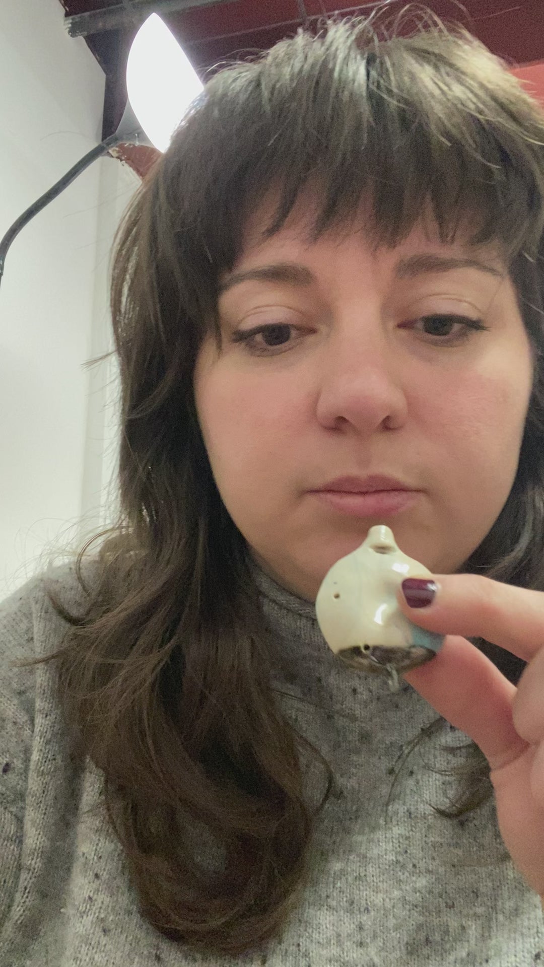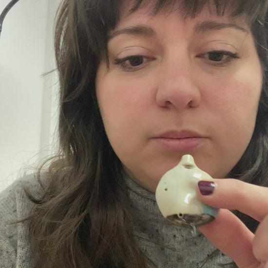 Round porcelain flute pendant with blue and red marbling, glossy glaze, and metallic finish. Includes 24" stainless steel chain. Indents are perfect for fidgeting.