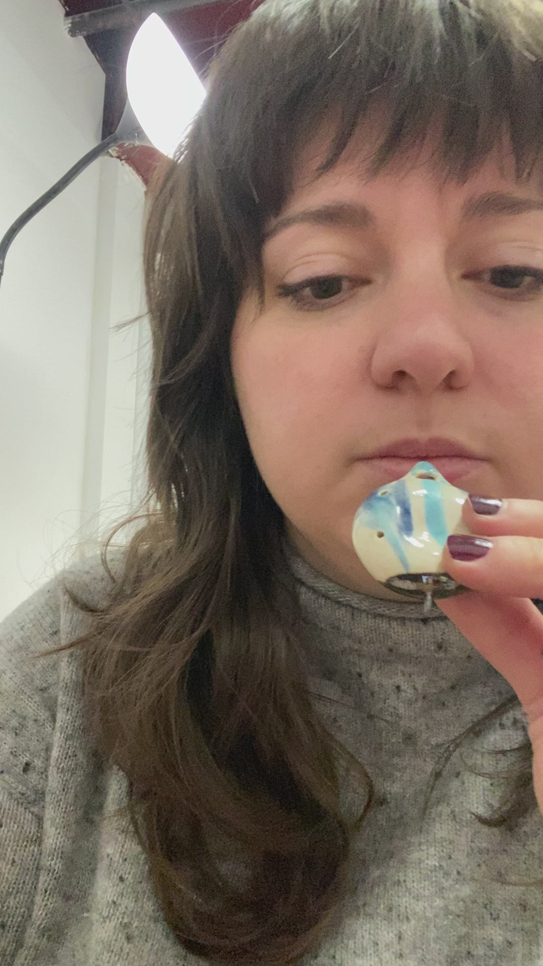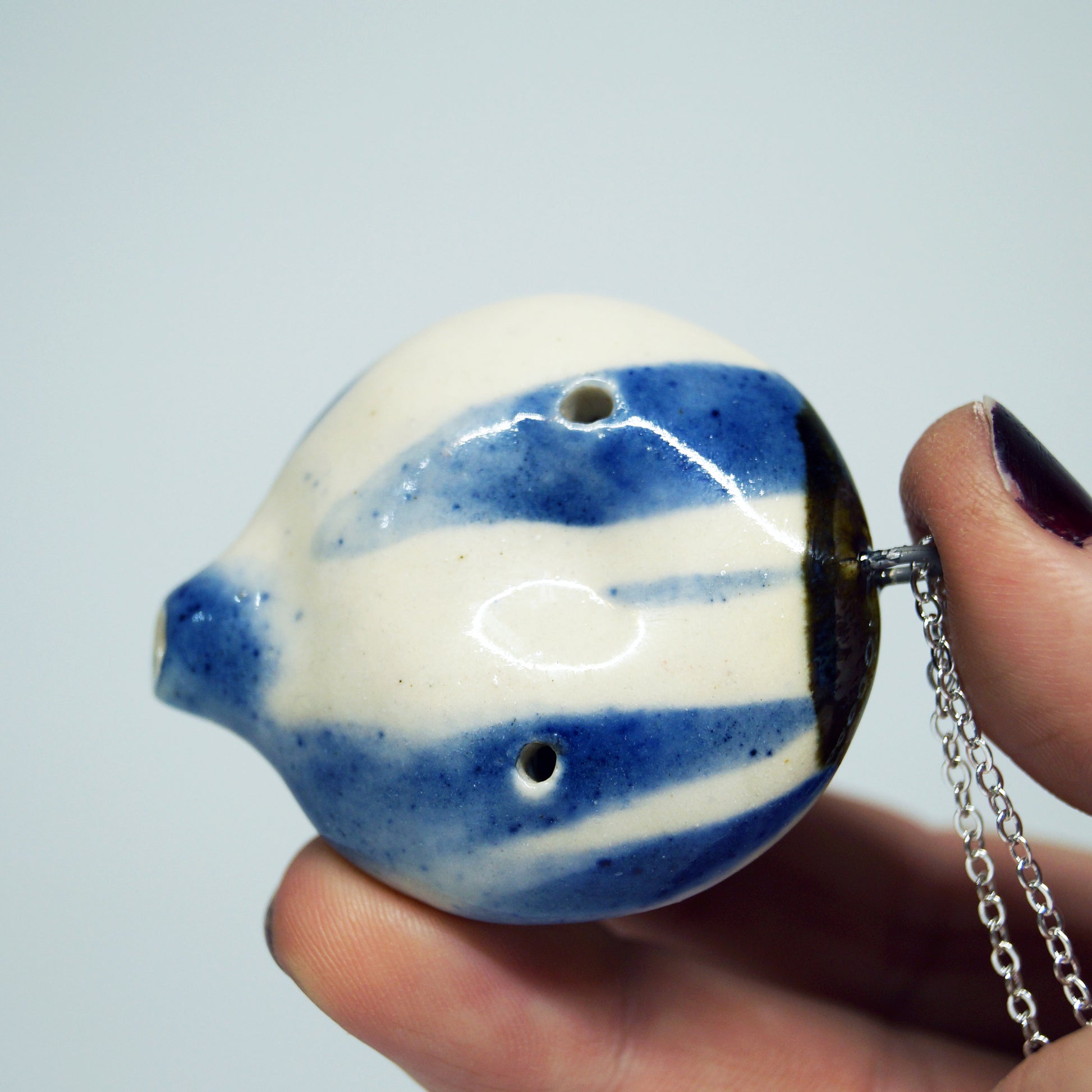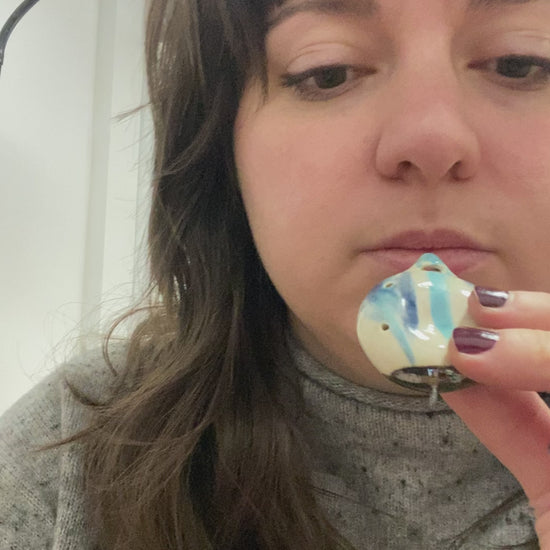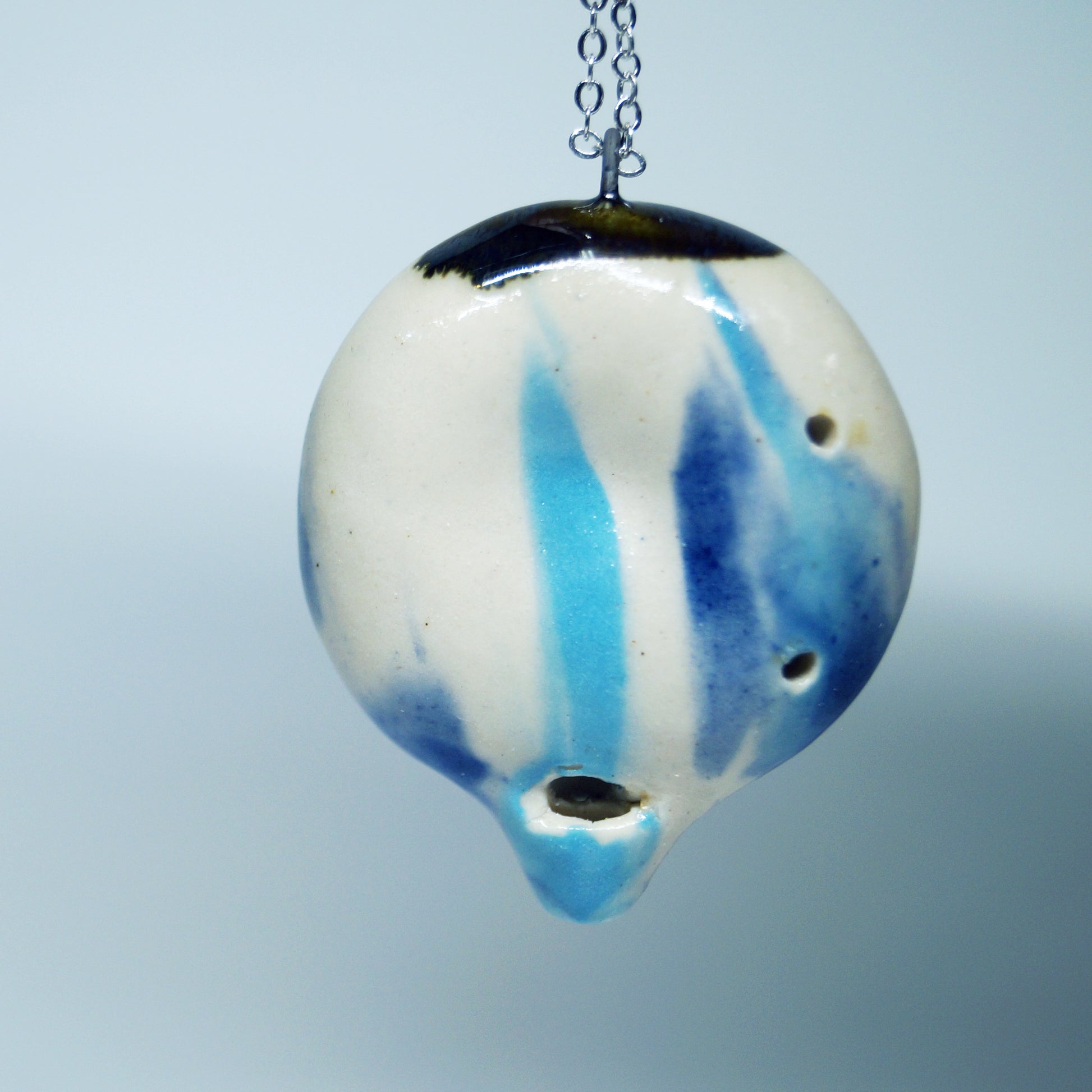 Round porcelain flute pendant with blue marbling, glossy glaze, and metallic finish. Includes 24" stainless steel chain. Indents are perfect for fidgeting.