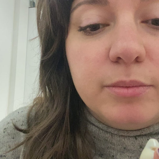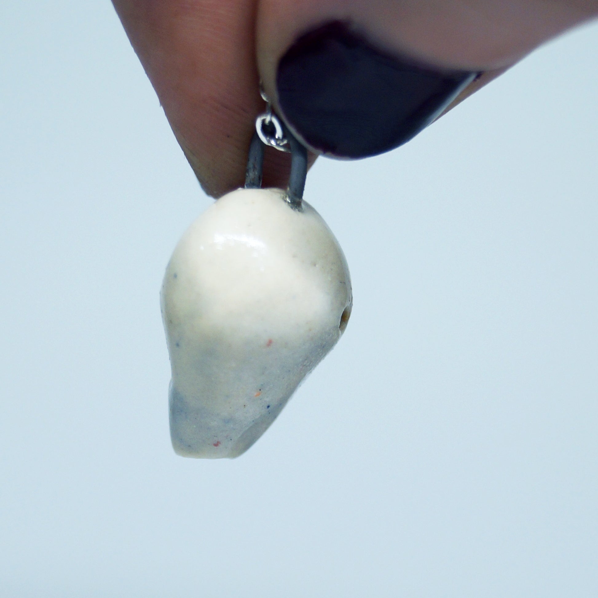 Round porcelain flute pendant with blue marbling and clear glaze. Includes 24" stainless steel chain.