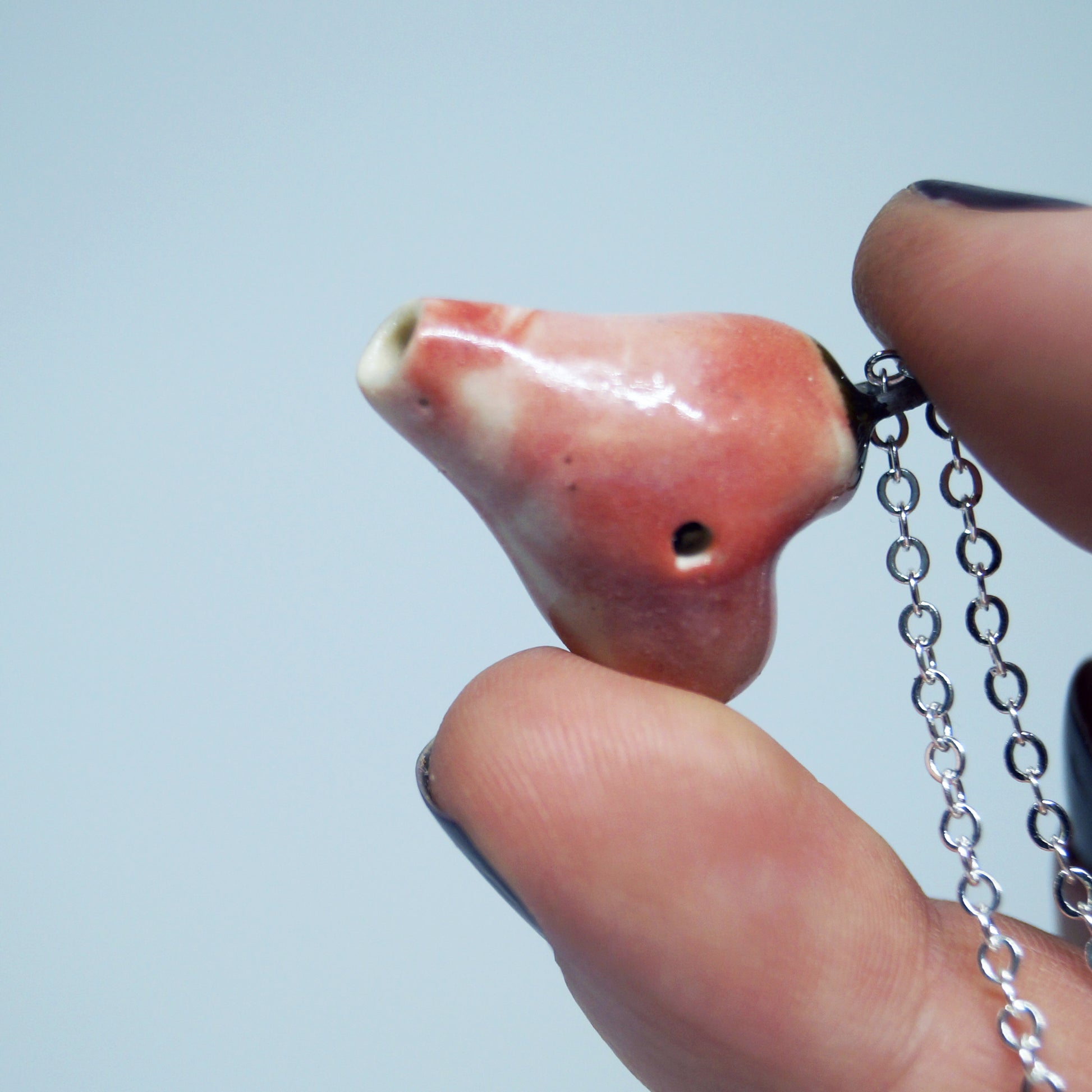 Heart-shaped porcelain flute pendant with red marbling and glossy finish. Includes 24" stainless steel chain.