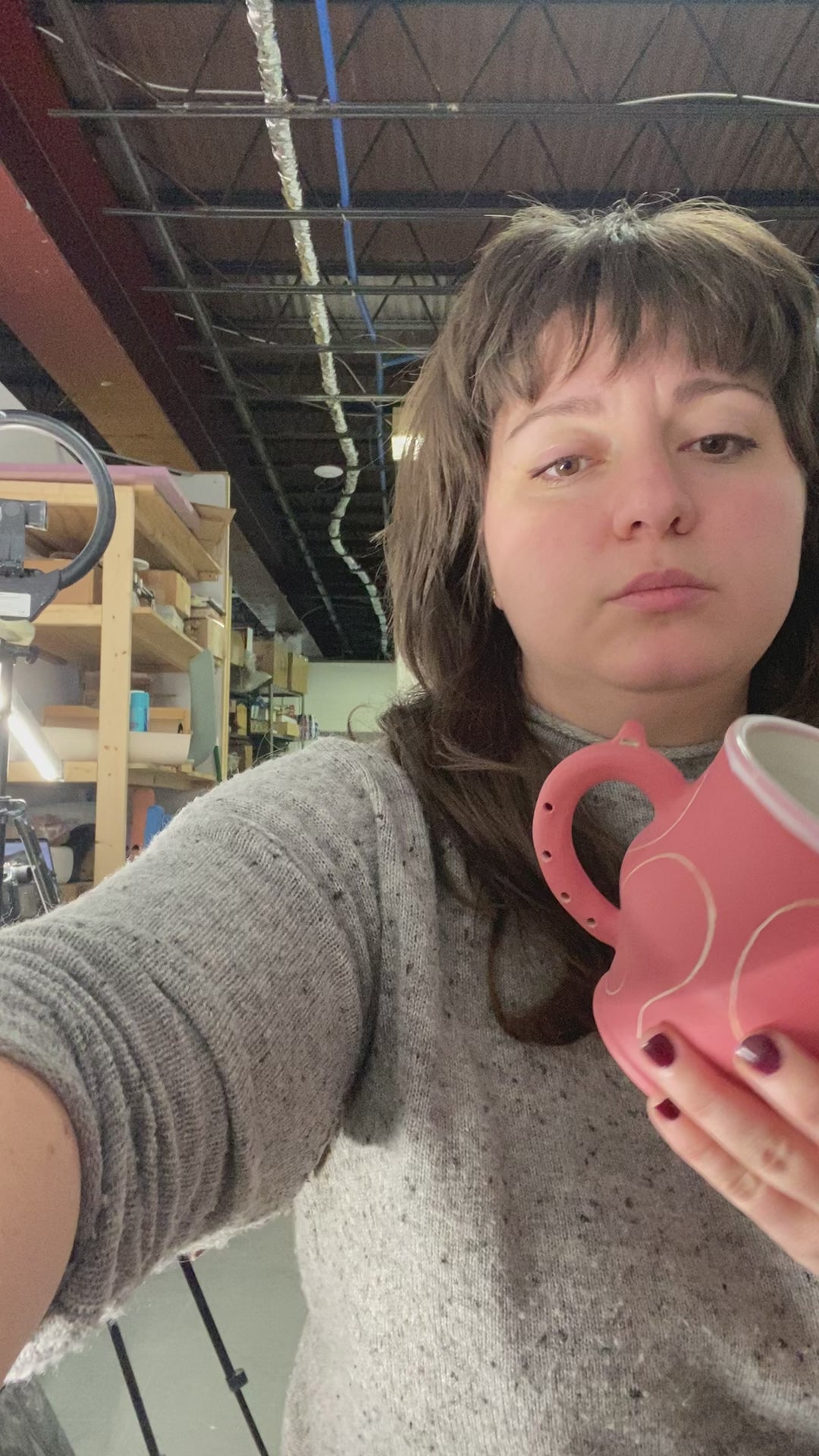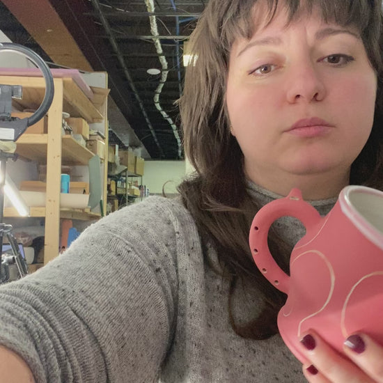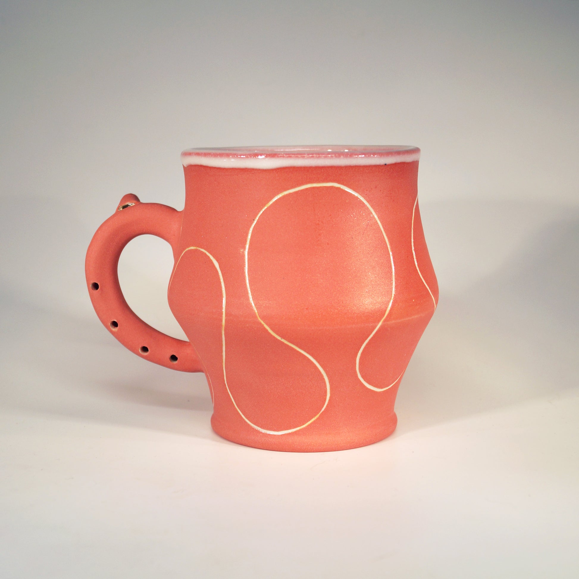 Flute mug with 20oz capacity in Guava with Squiggle pattern. Porcelain with white-glazed interior.