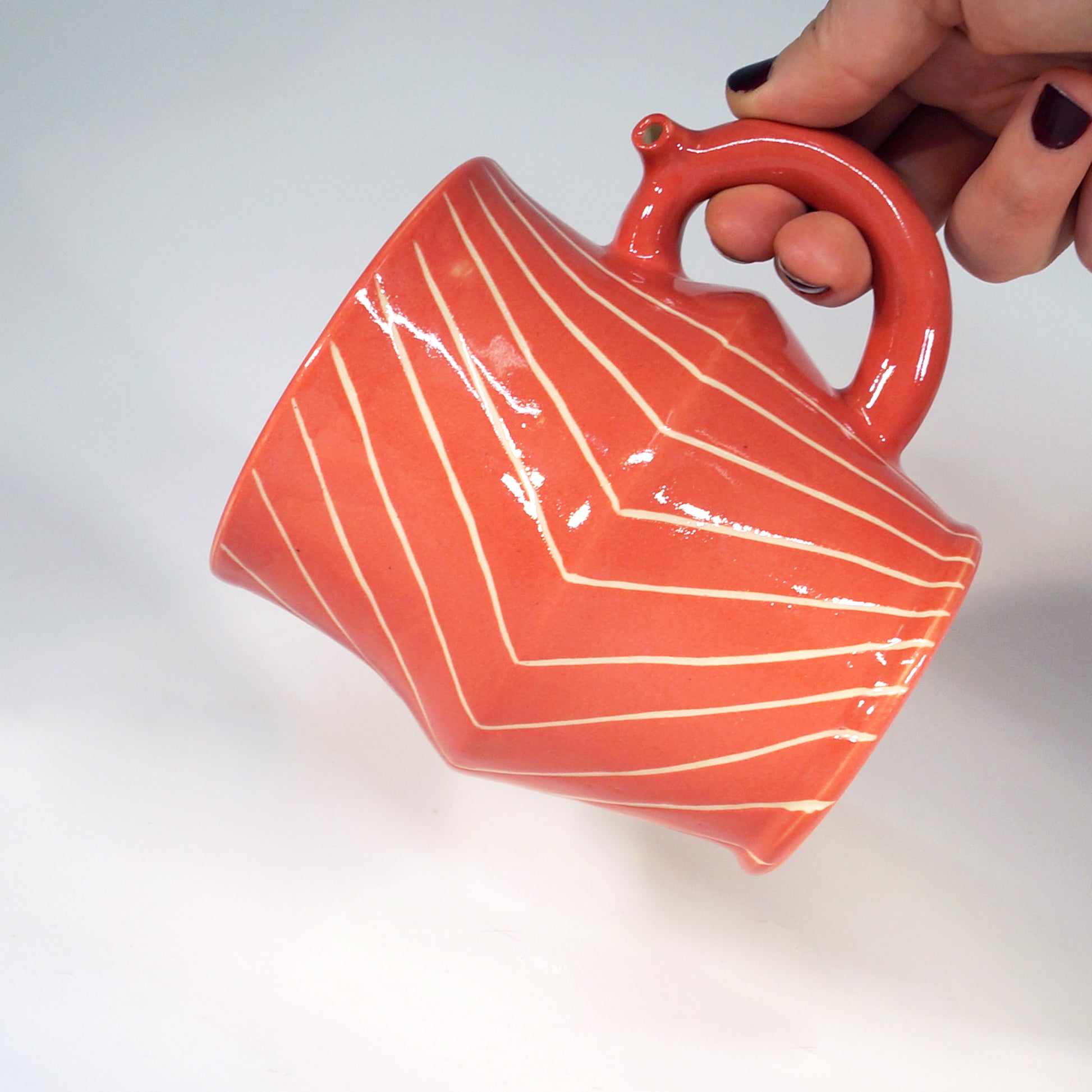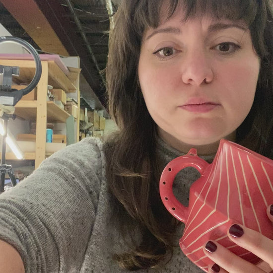 Flute mug with 20oz capacity in Guava with Angles pattern. Porcelain with glossy clear glaze.