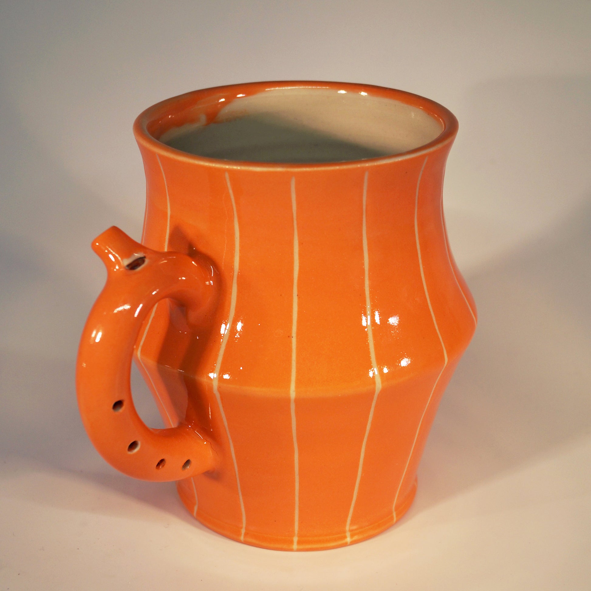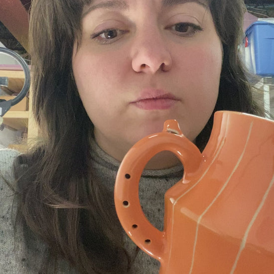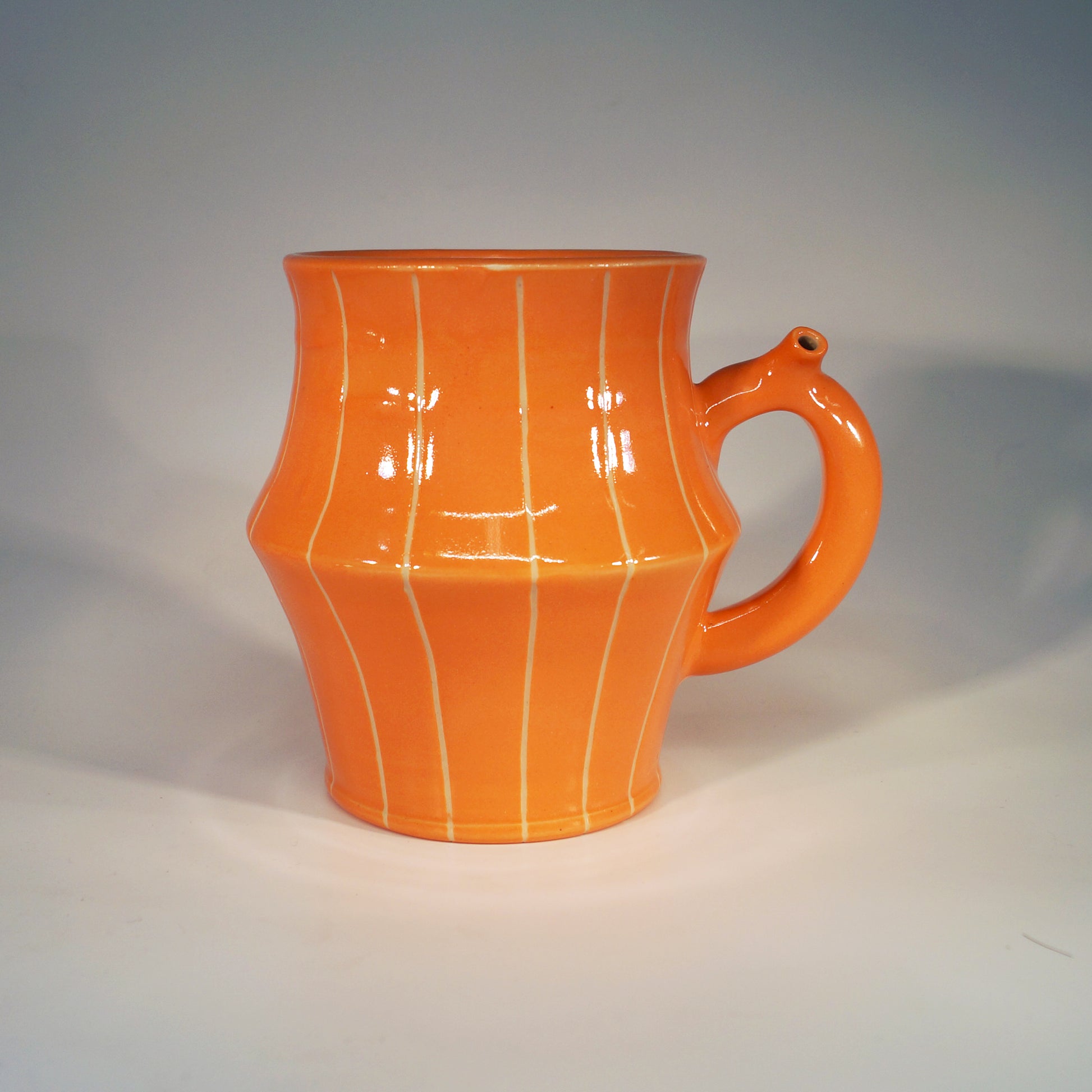 Flute Mug with 20oz capacity in Peach with Pinstripe pattern. Porcelain with glossy clear glaze.