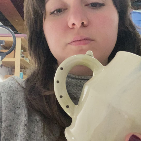 Flute Mug with 20oz capacity in marbled Sage and Cobalt. Porcelain with glossy clear glaze.