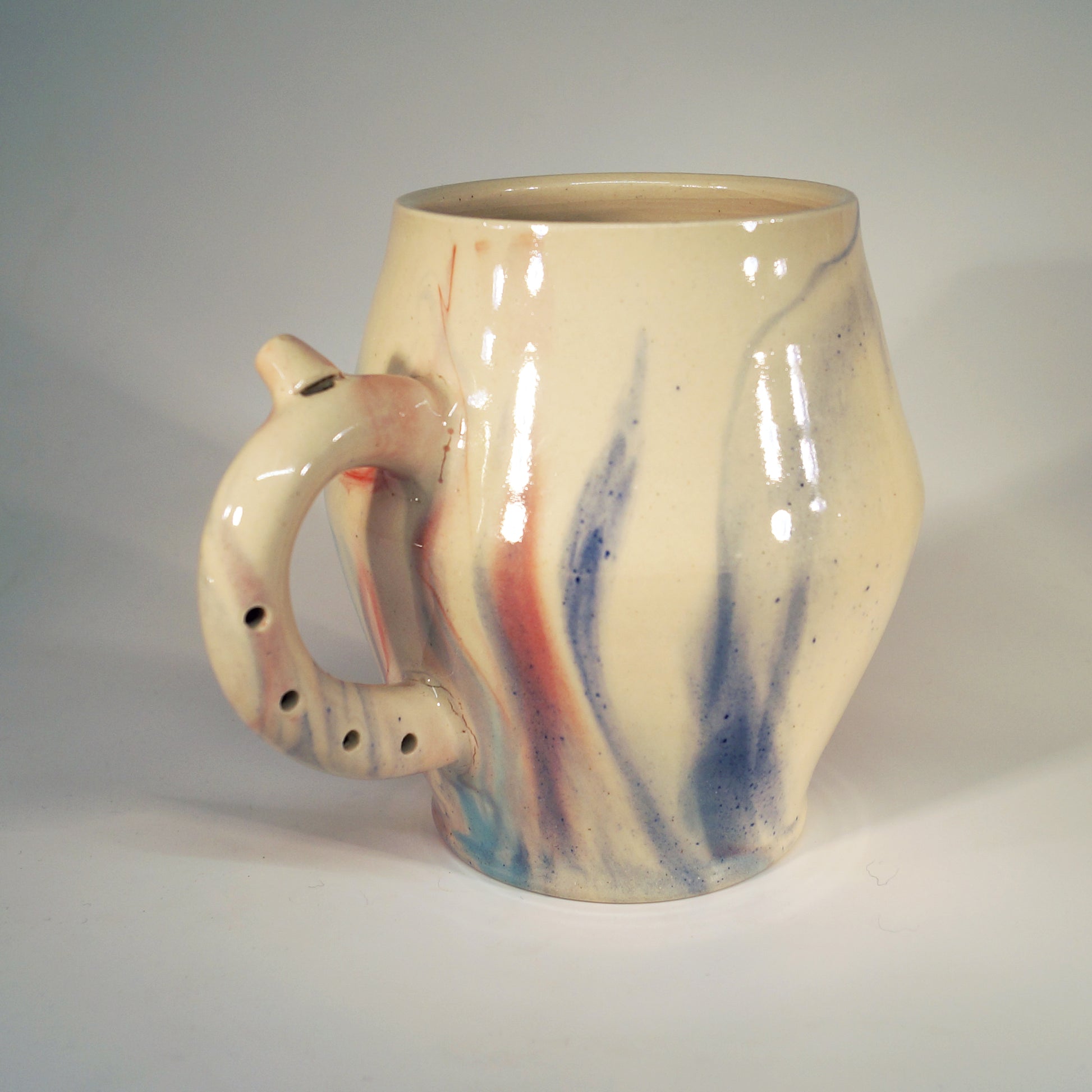 Flute Mug with 20oz capacity in marbled Guava, Sky, and Cobalt. Porcelain with glossy clear glaze.