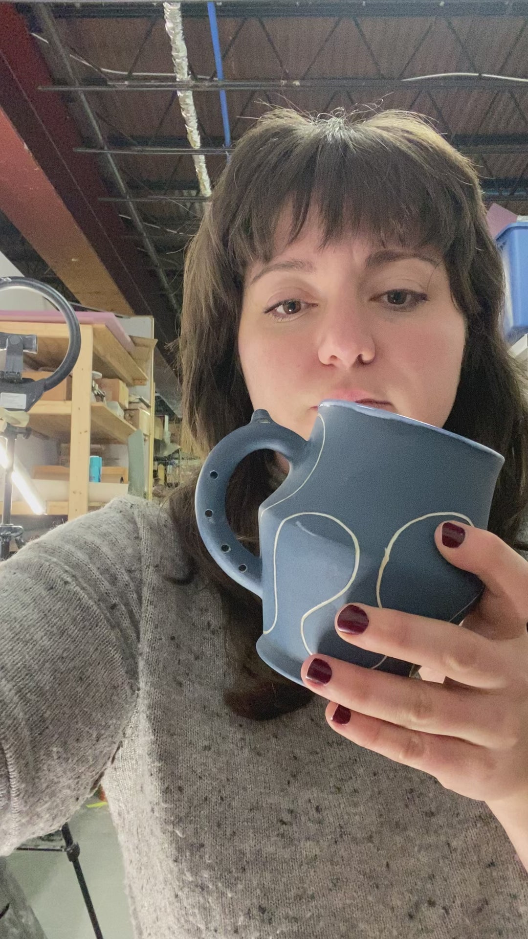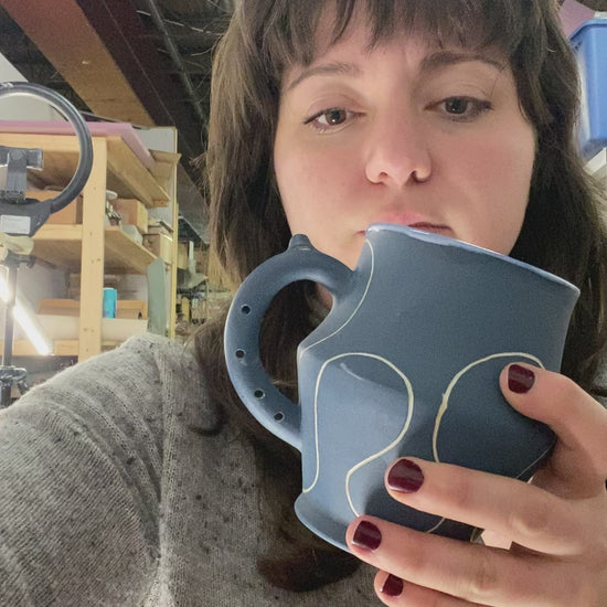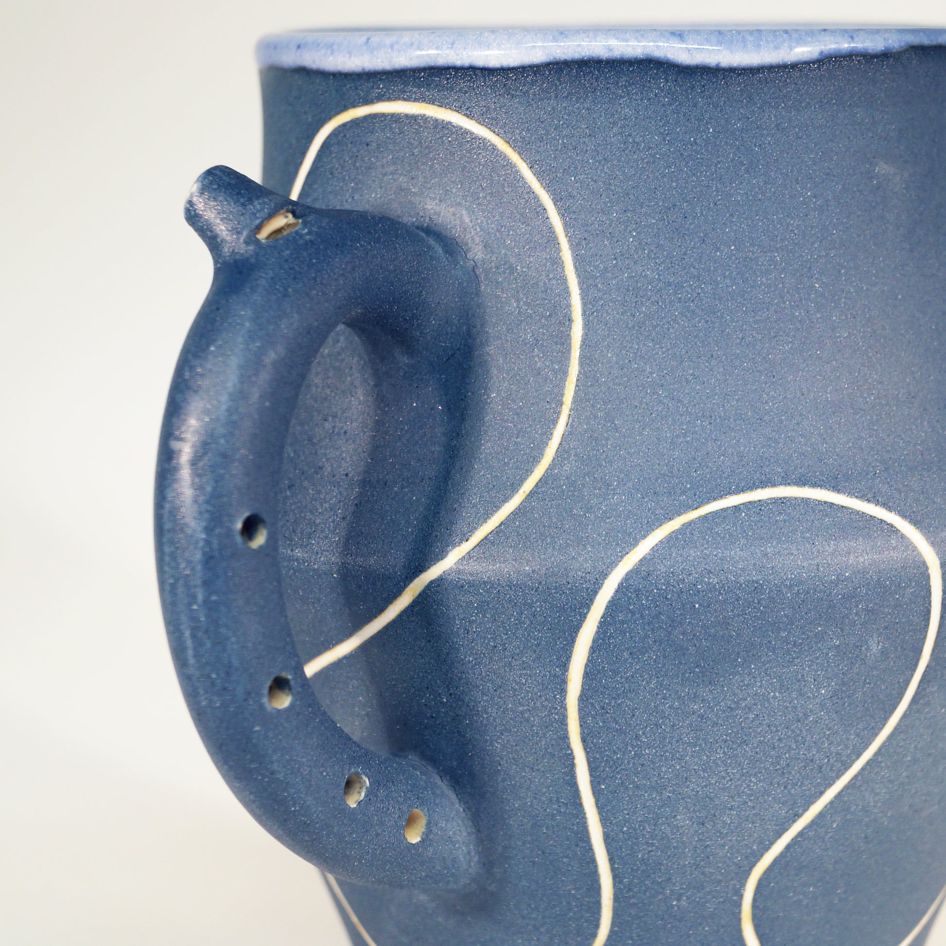 Flute mug with 20oz capacity in Cobalt with Squiggle pattern. Porcelain with white-glazed interior.