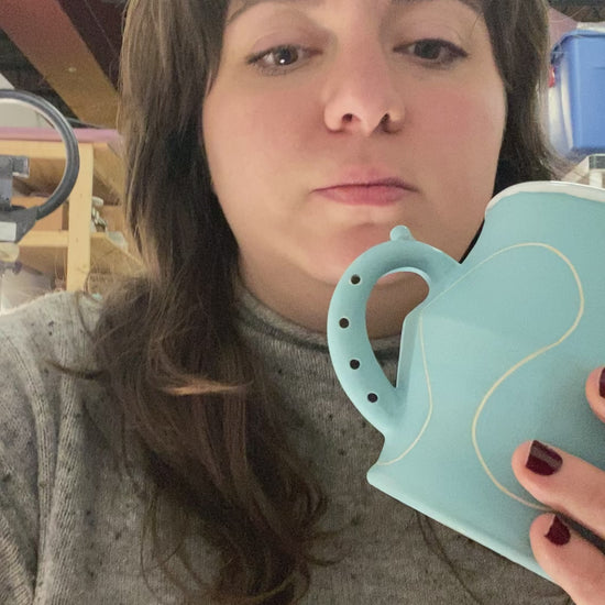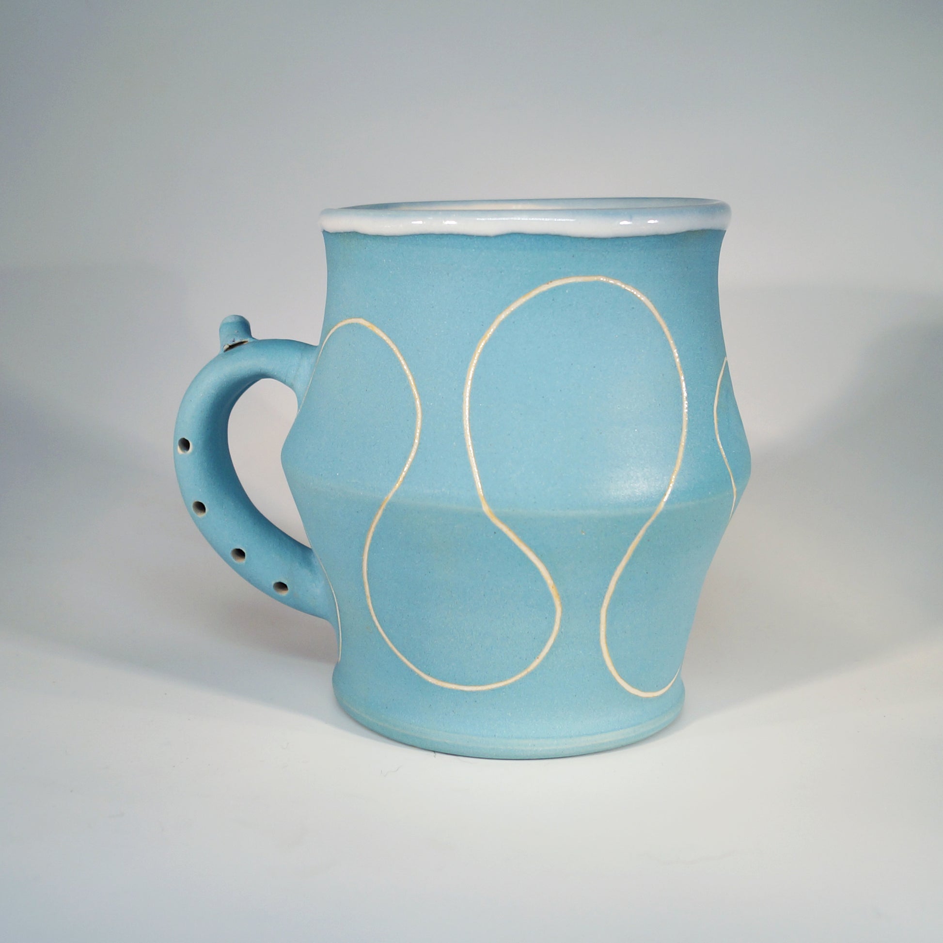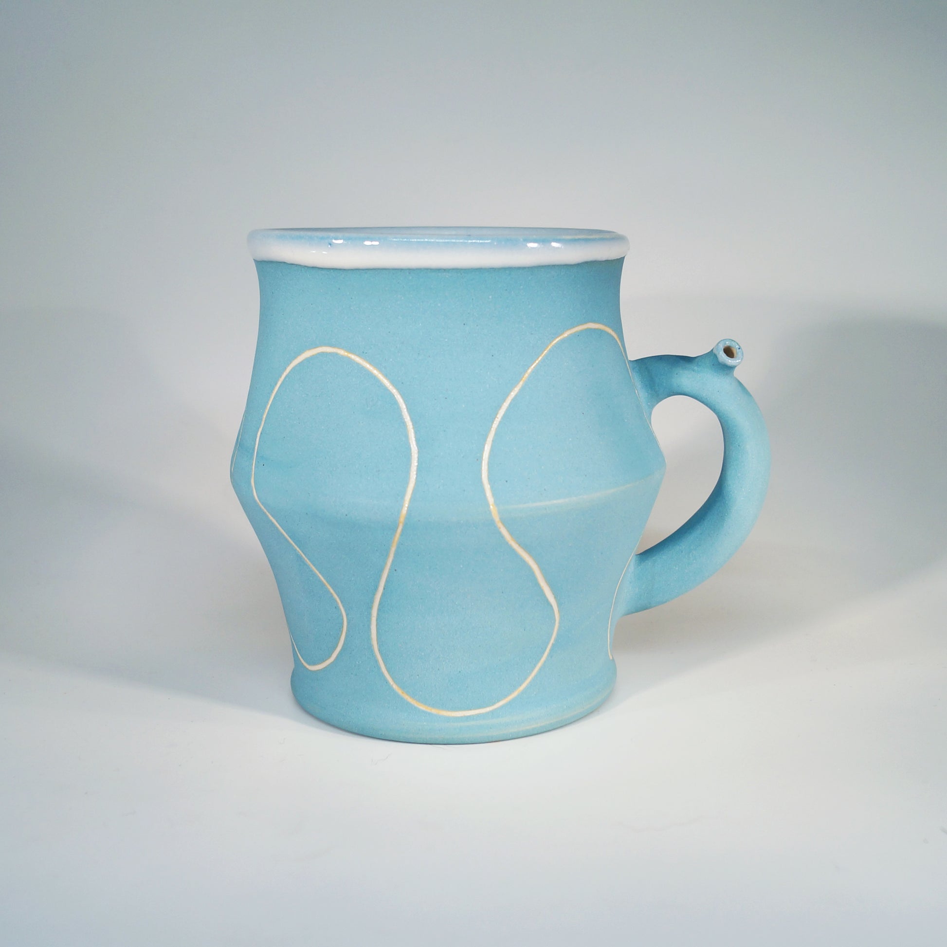Flute Mug with 20oz capacity in Sky with Squiggle pattern. Porcelain with white-glazed interior.