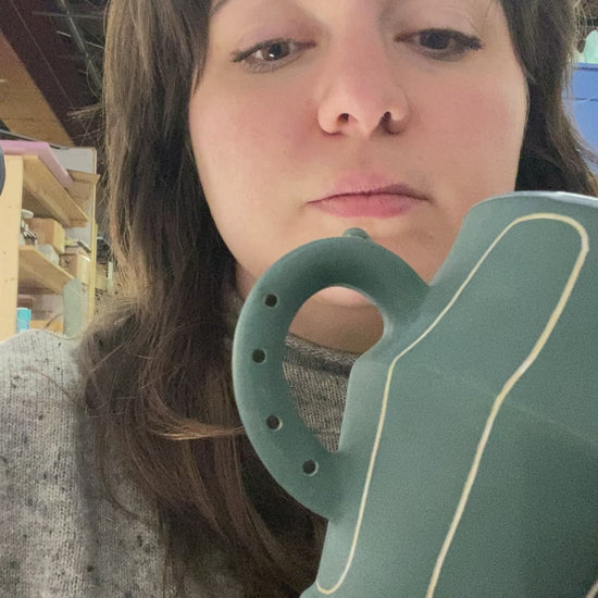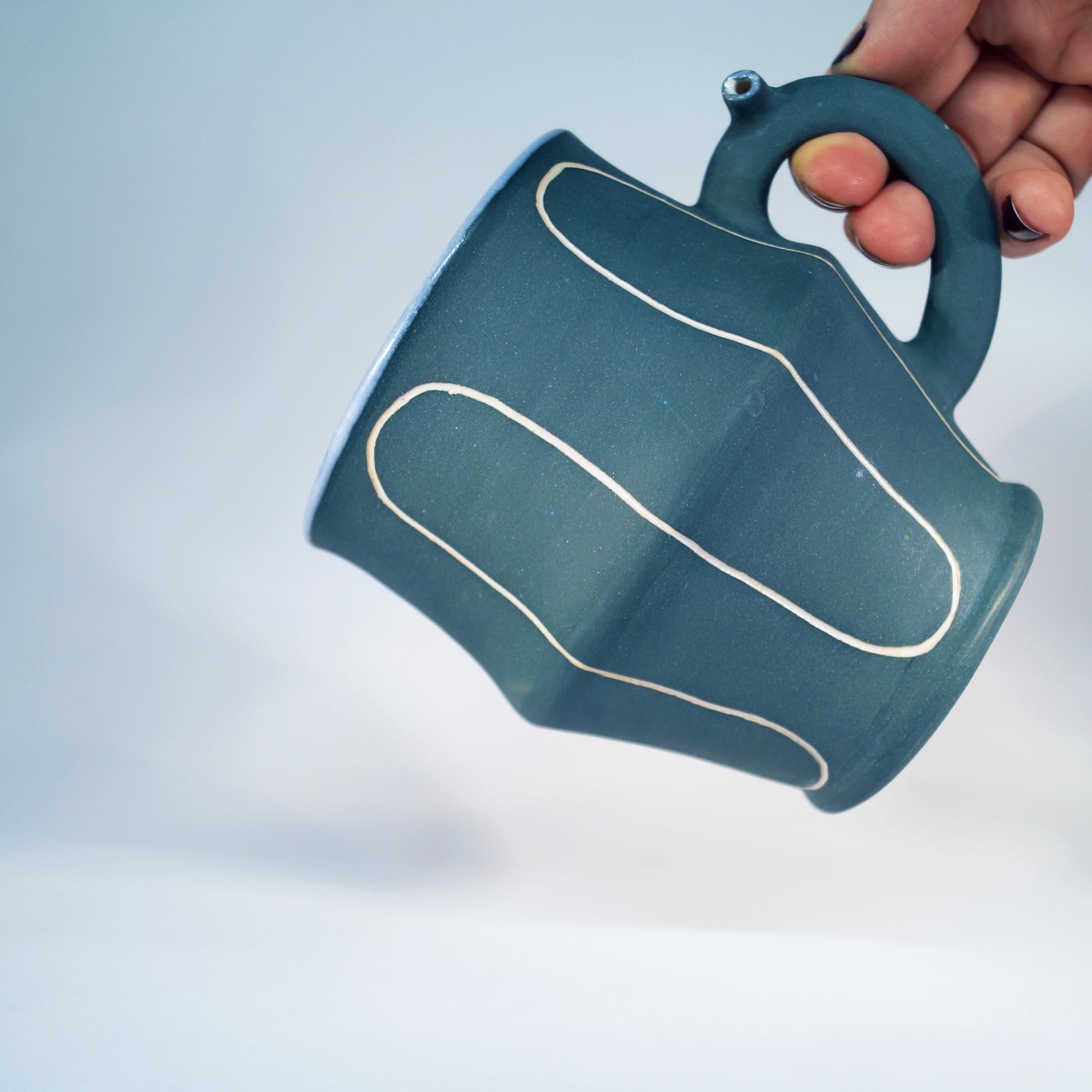 Flute Mug with 20oz capacity in Teal with Arches pattern. Porcelain with white-glazed interior.