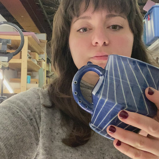 Flute mug with 20oz capacity in Cobalt with Angles pattern. Porcelain with glossy clear glaze.