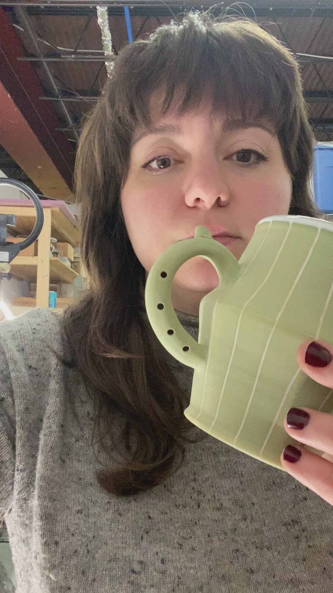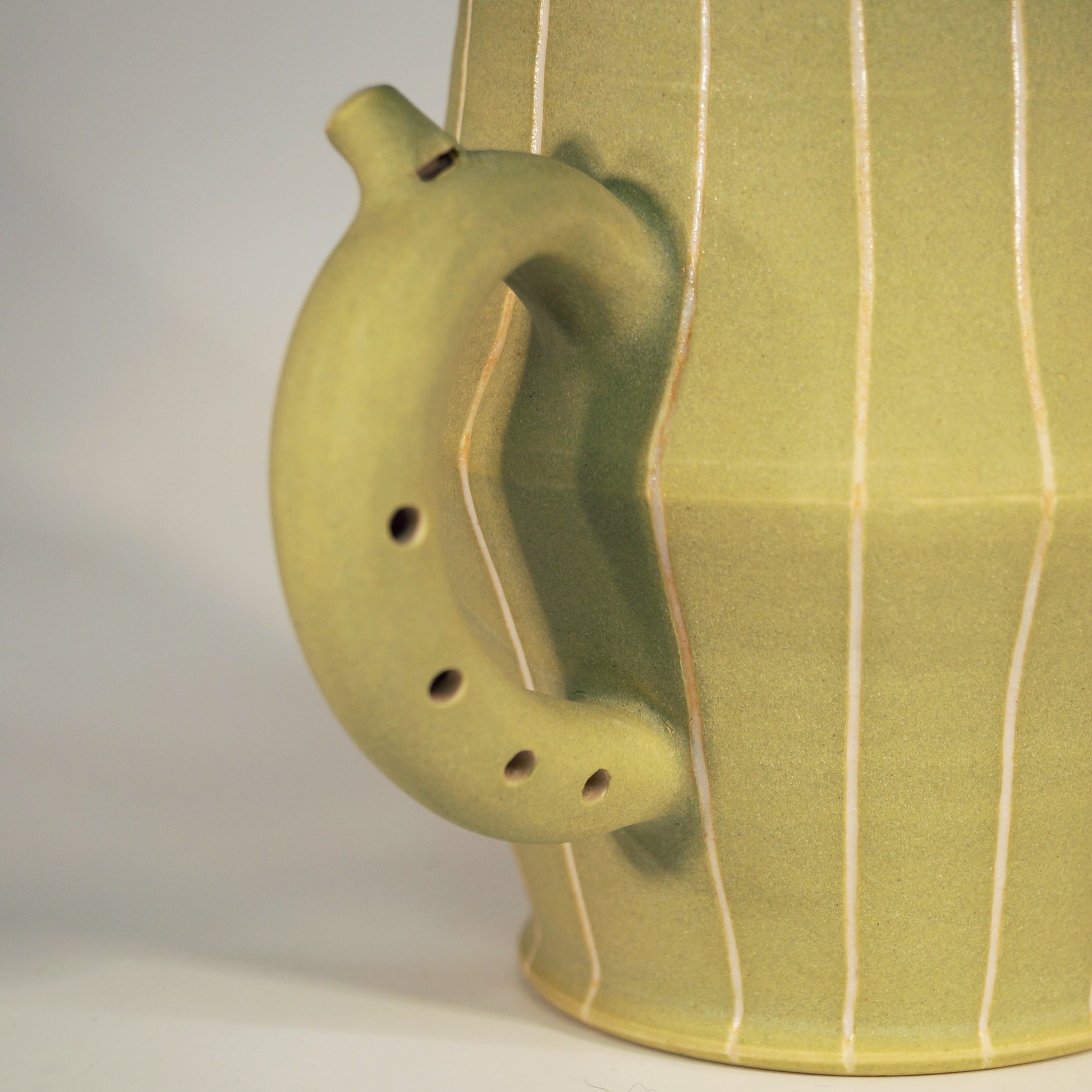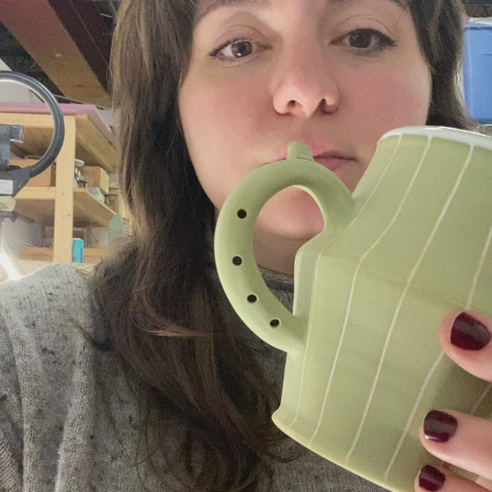 Flute Mug with 20oz capacity in Sage with Pinstripe pattern. Porcelain with white-glazed interior.