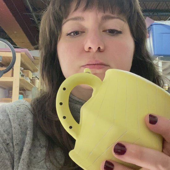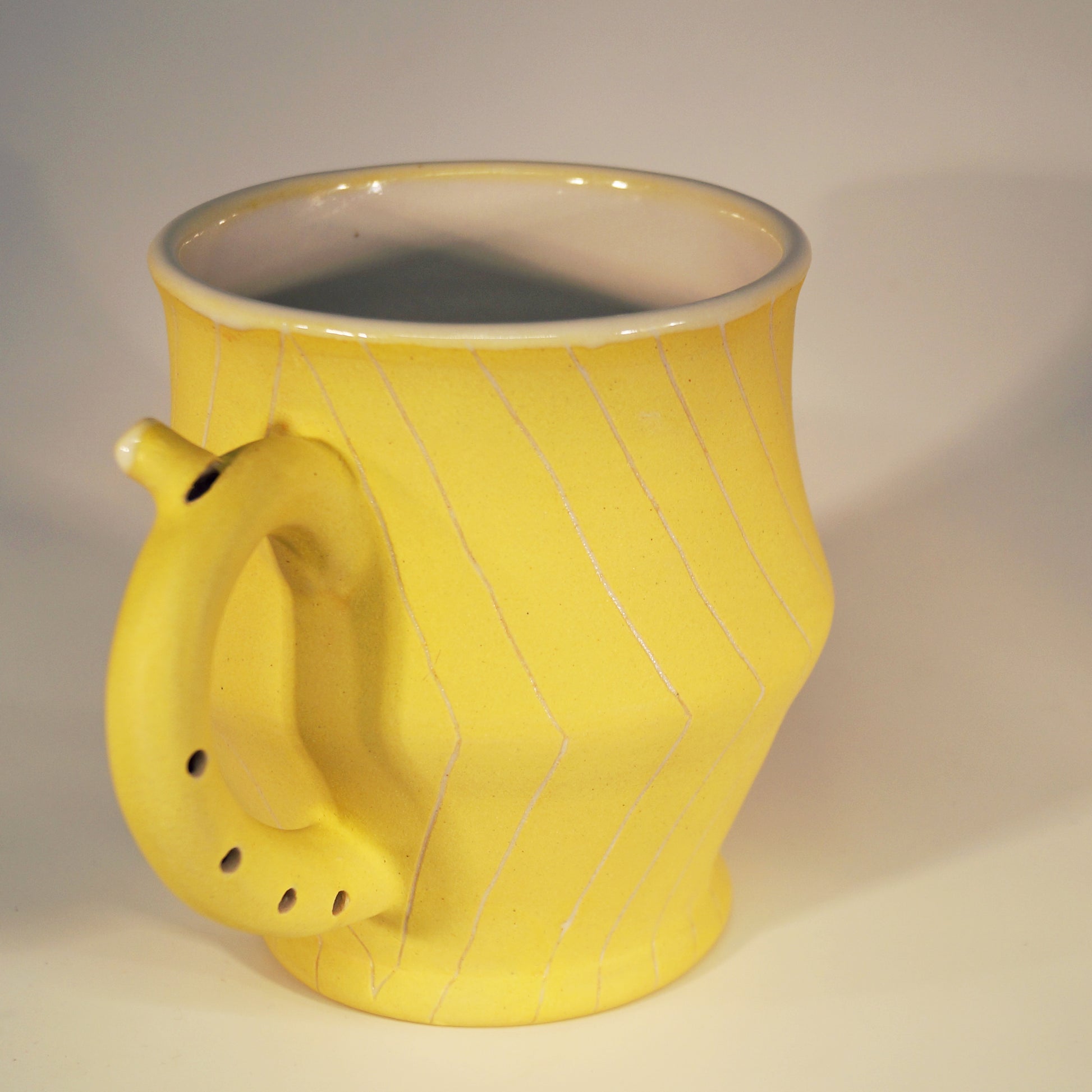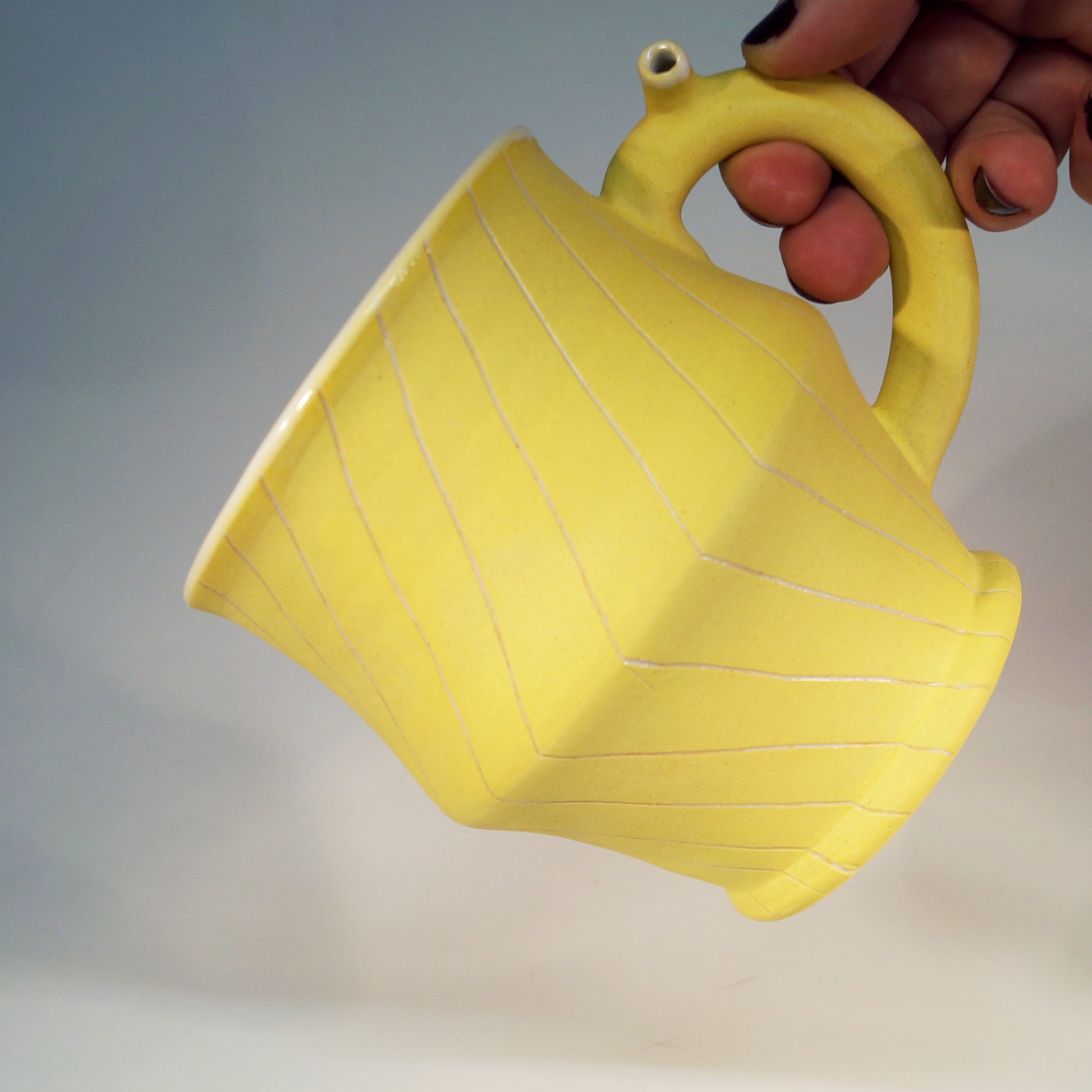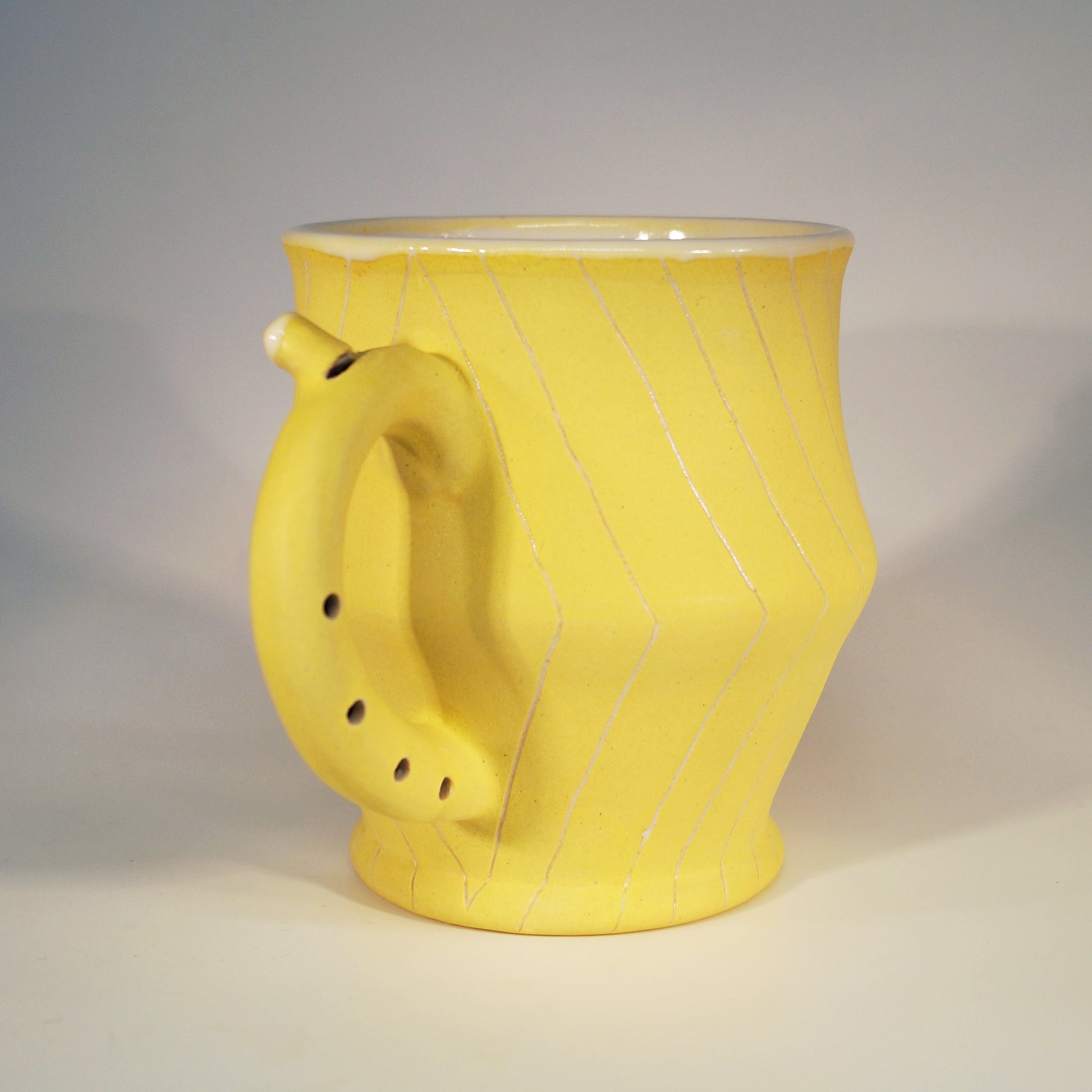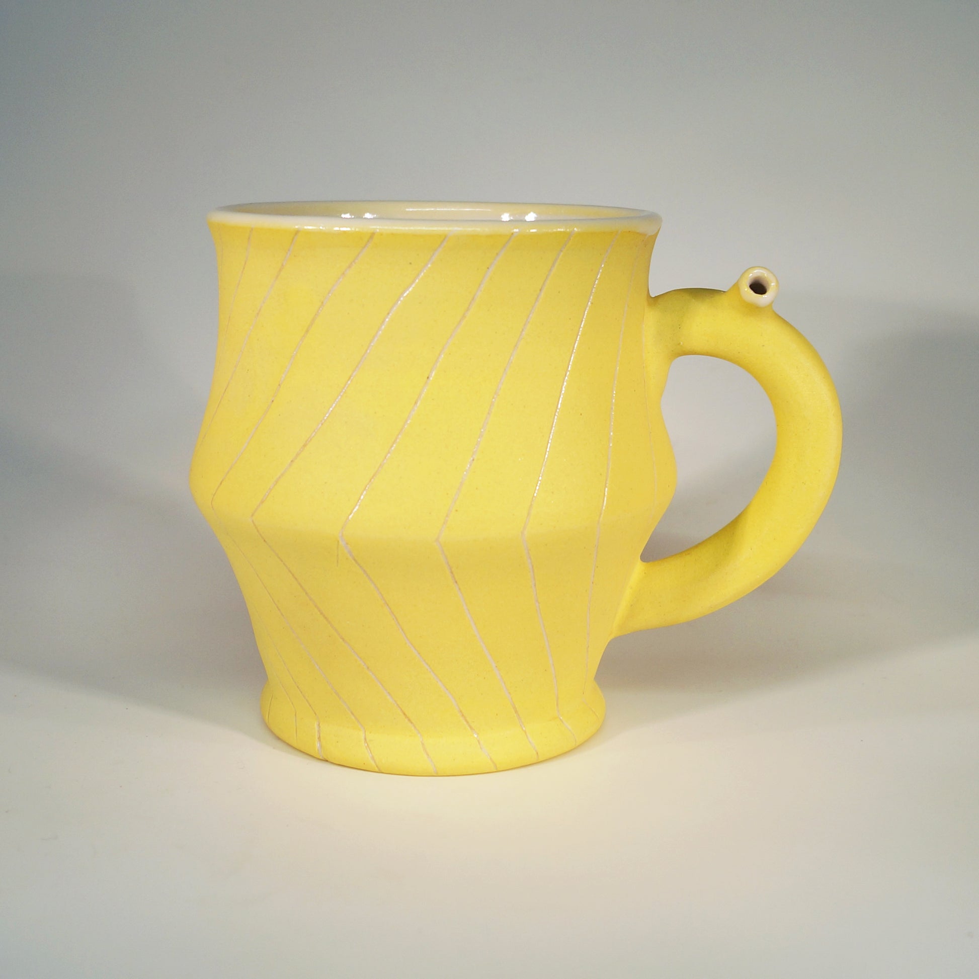 Flute Mug with 20oz capacity in Sunshine with Angles pattern. Porcelain with white-glazed interior.
