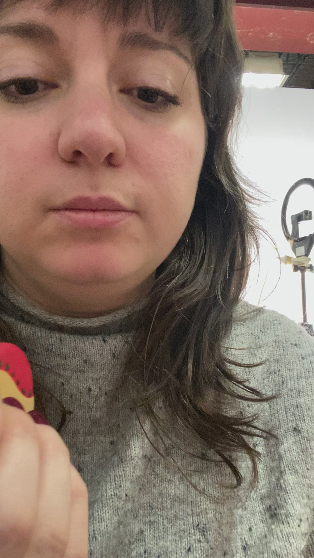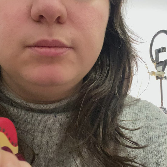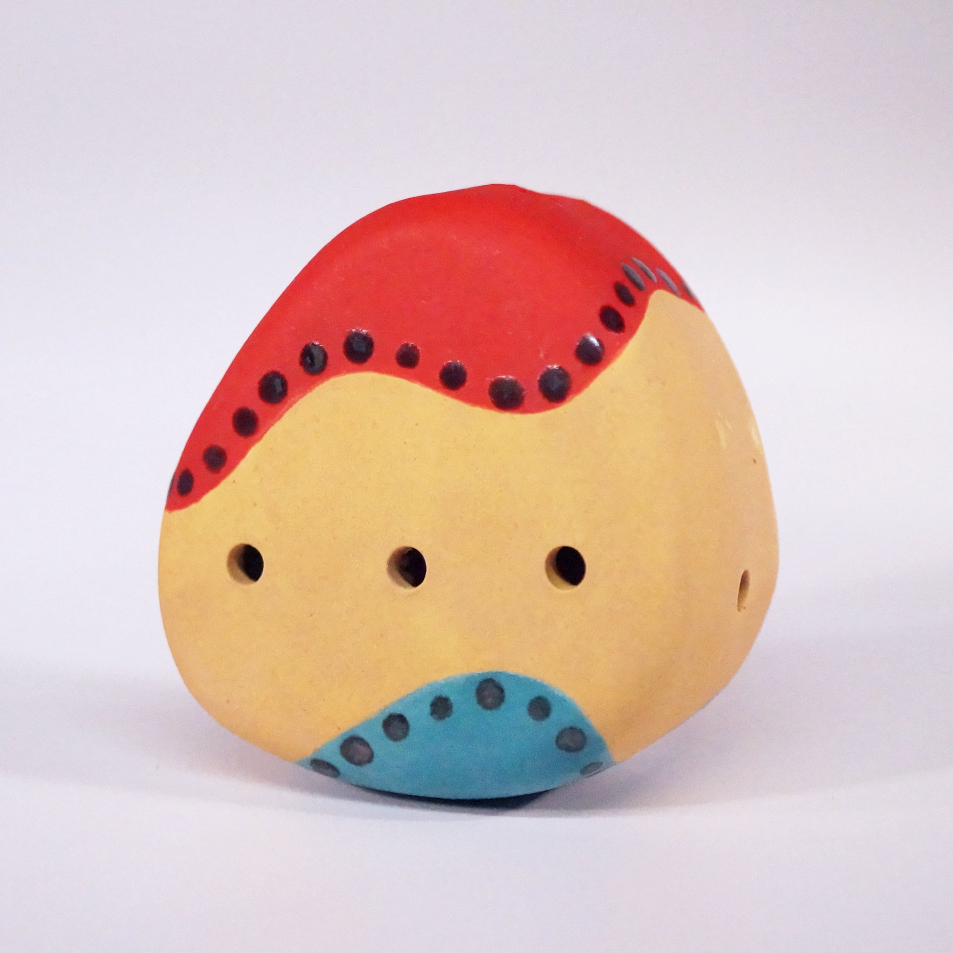 Pocket-sized flute with teal, gold, and red. Metallic dots. Made of stoneware.