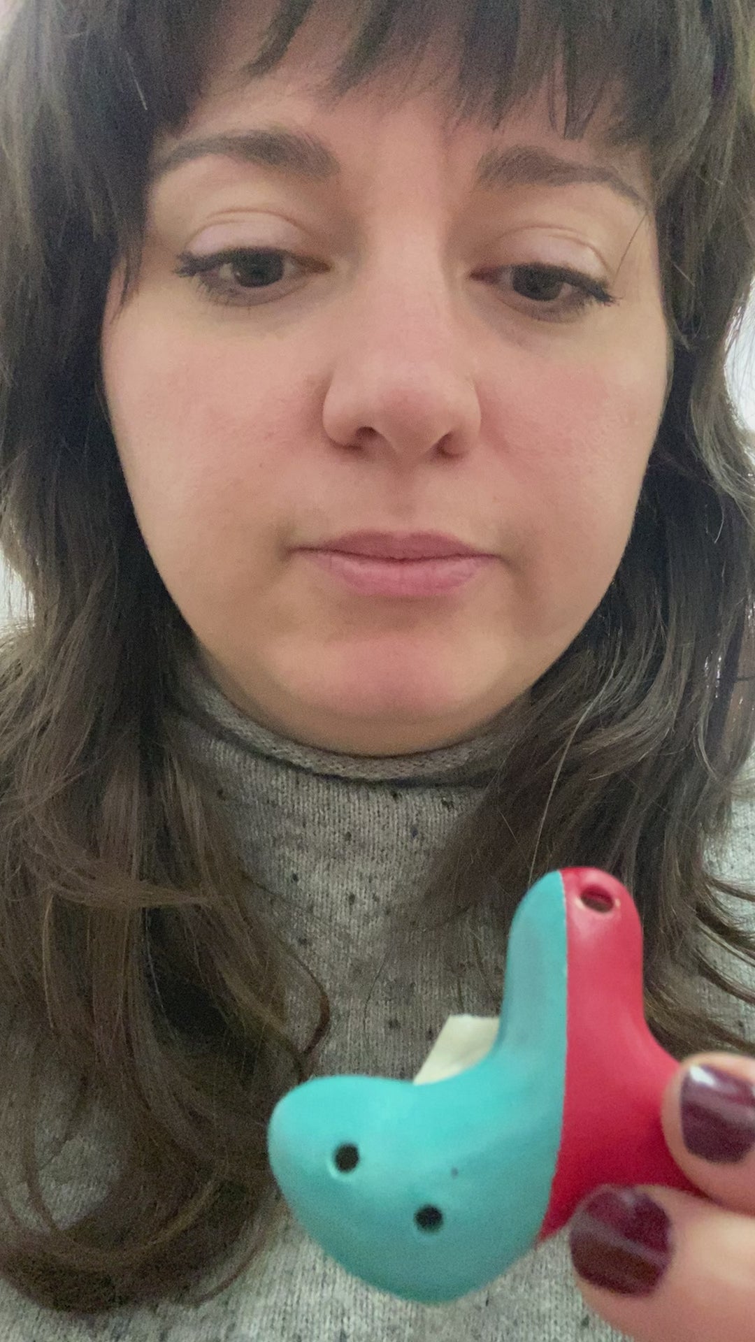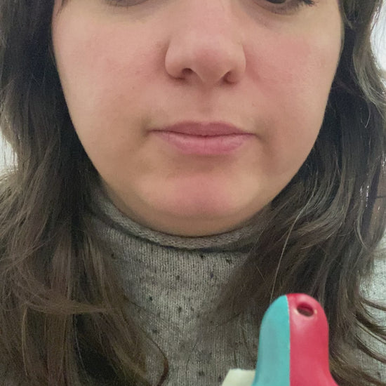 Pocket-sized flute with red and teal. Made of stoneware.