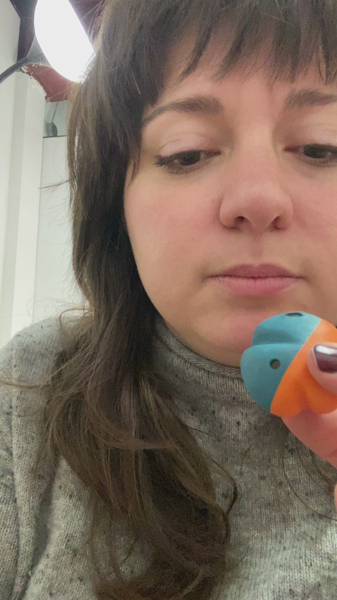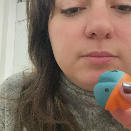 Pocket-size flute with orange and teal. Made of stoneware.