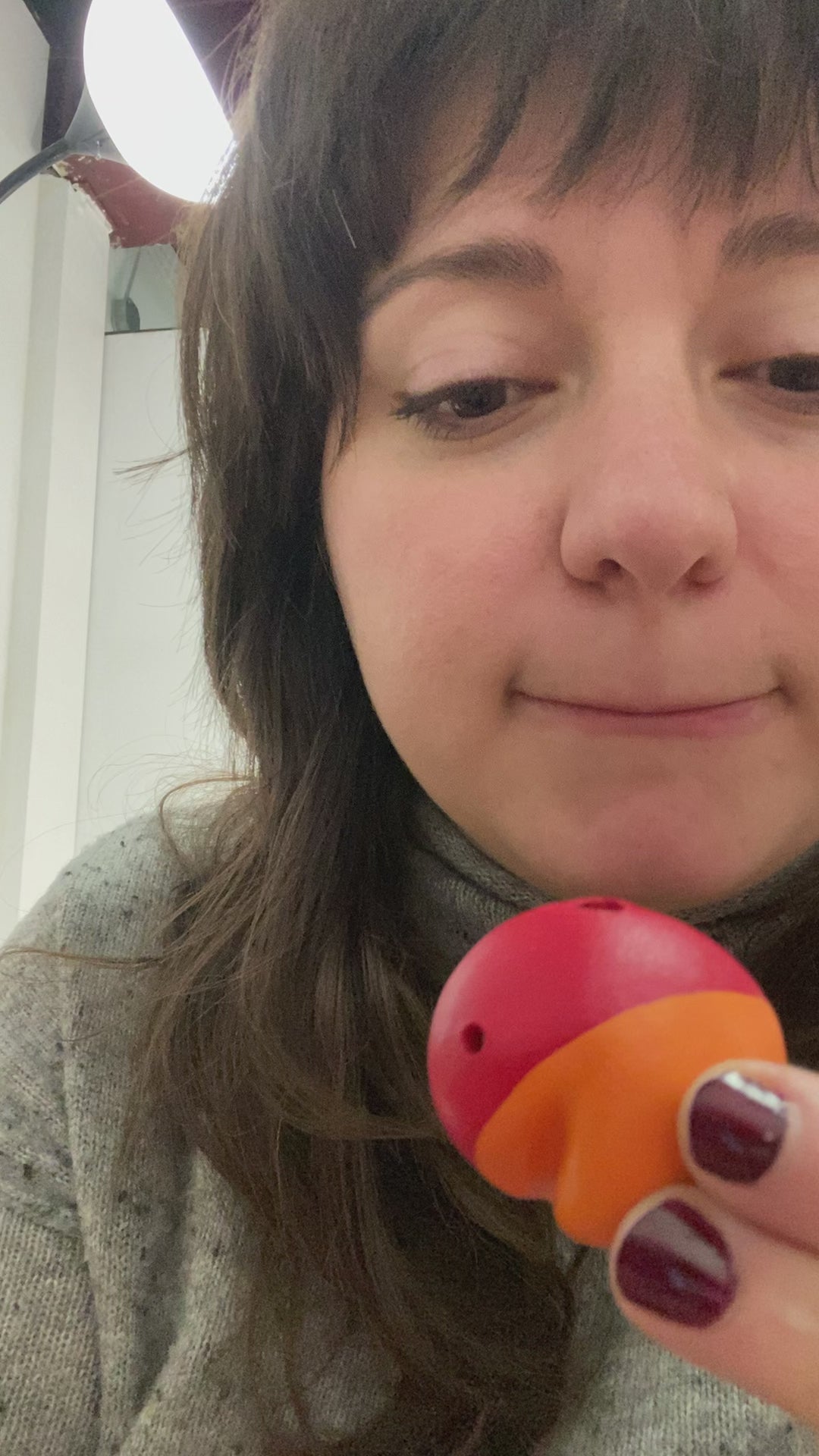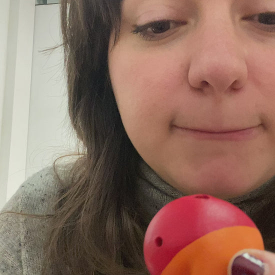 Pocket-size flute with orange and red. Made of stoneware.