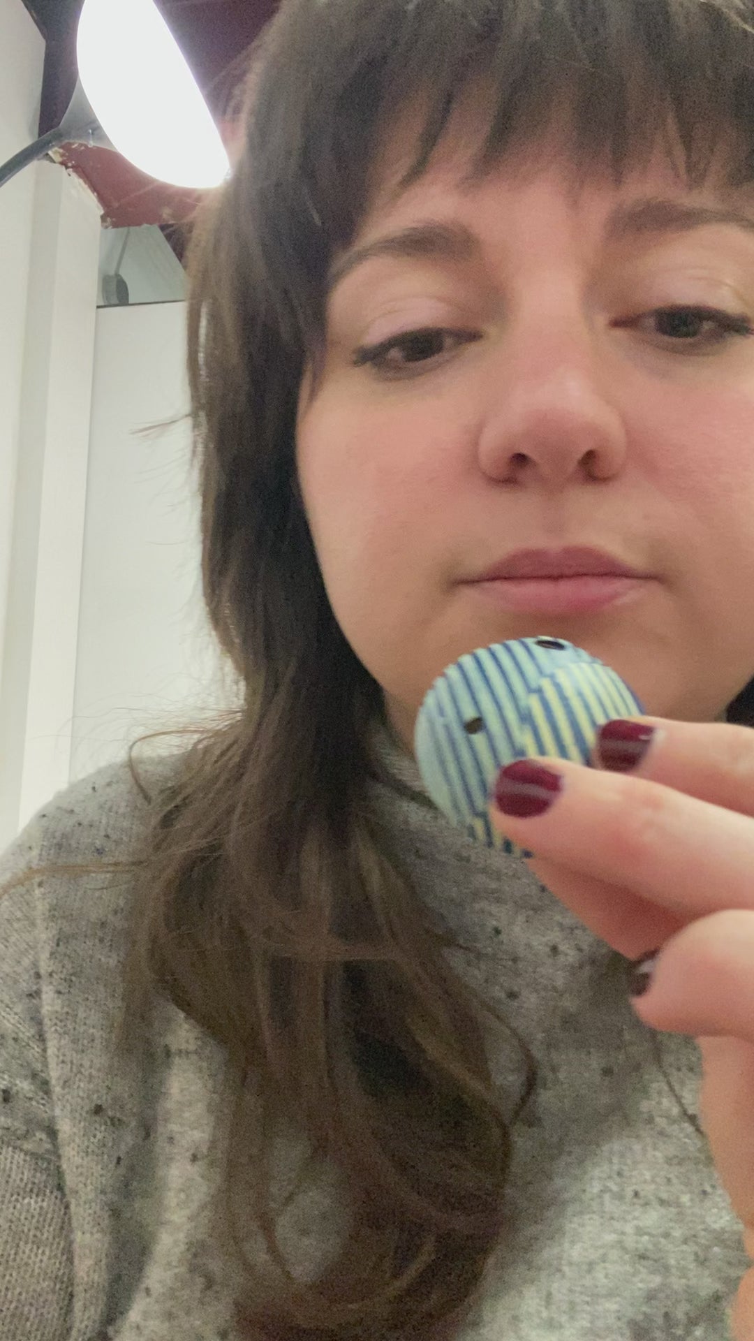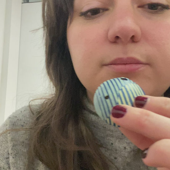 Round pocket-size flute with dark blue, light blue, and mint in a striped pattern. Made of stoneware.