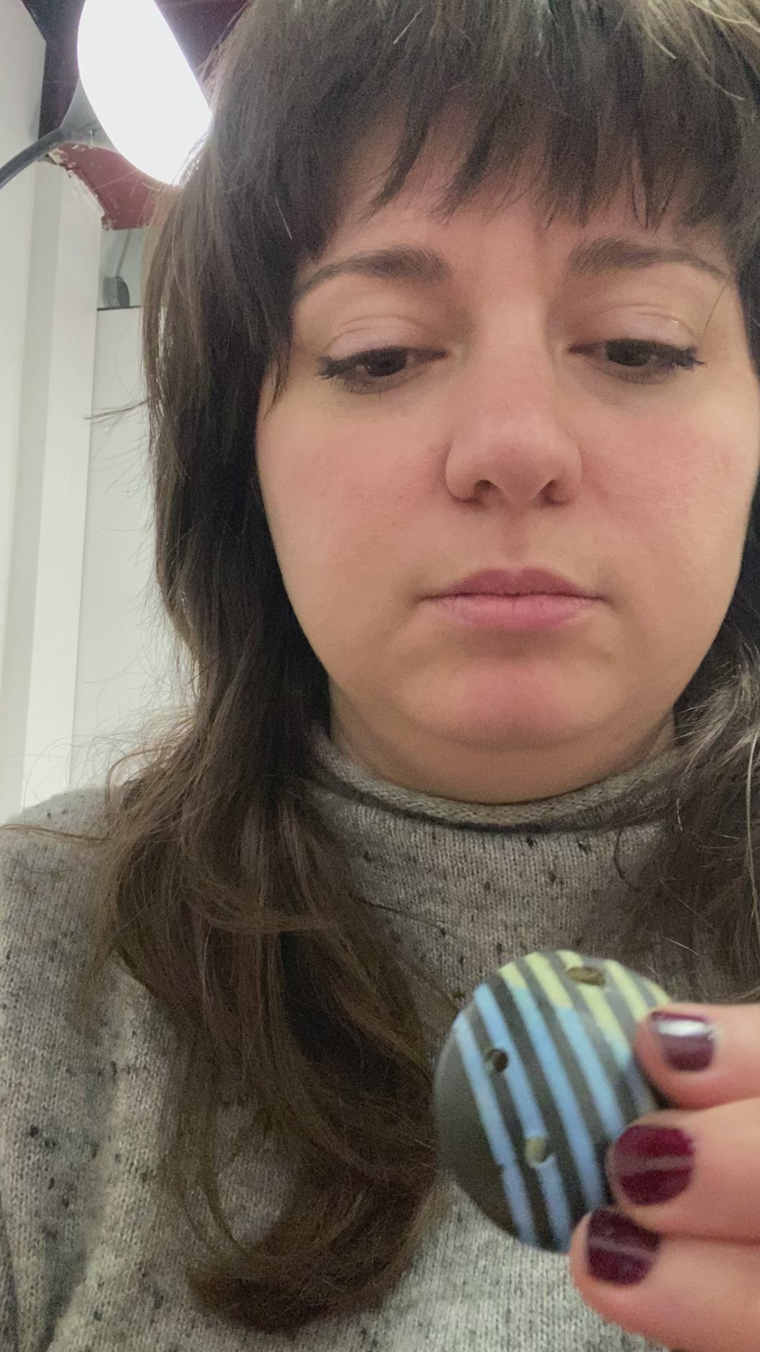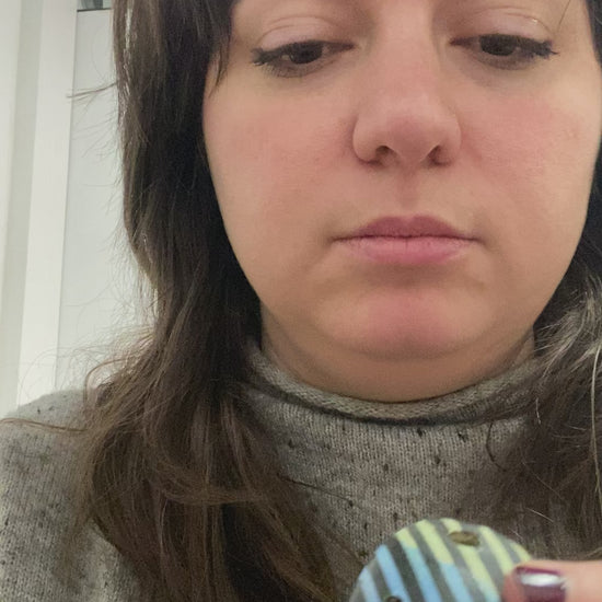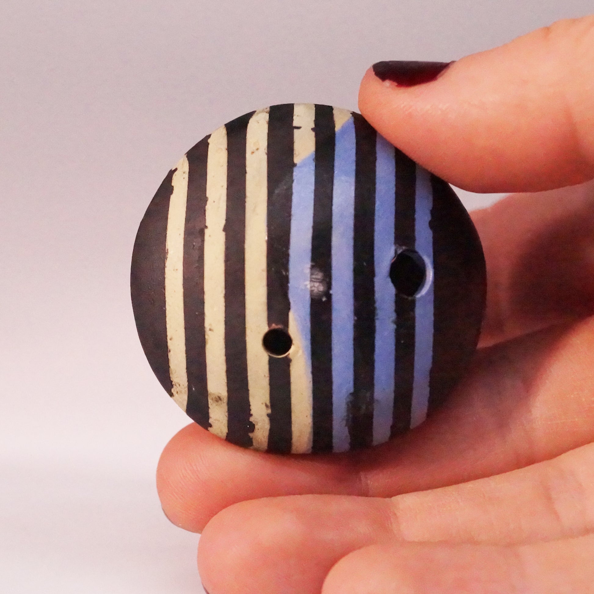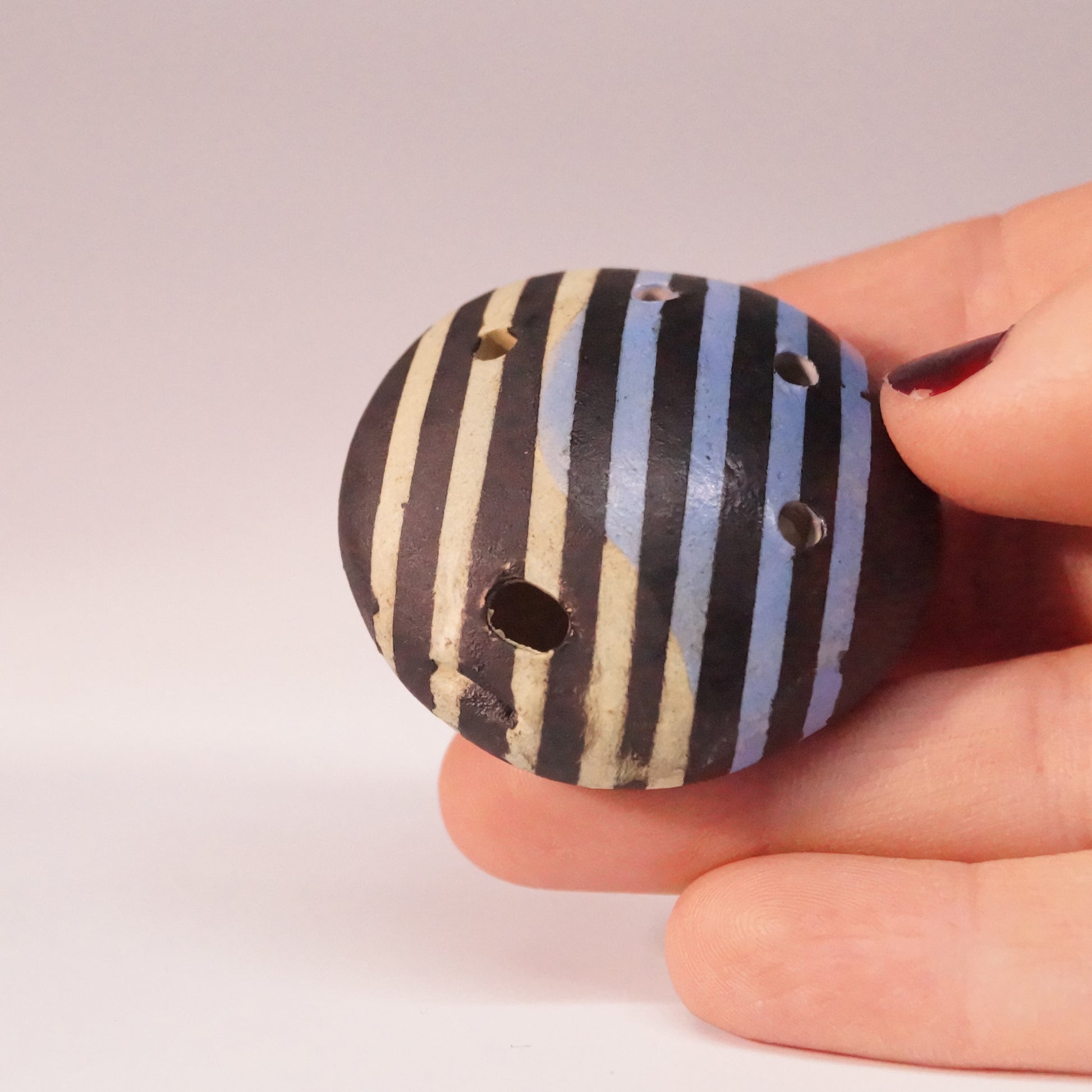 Round pocket-size flute with mint, light blue, and black in a striped pattern. Made of stoneware.