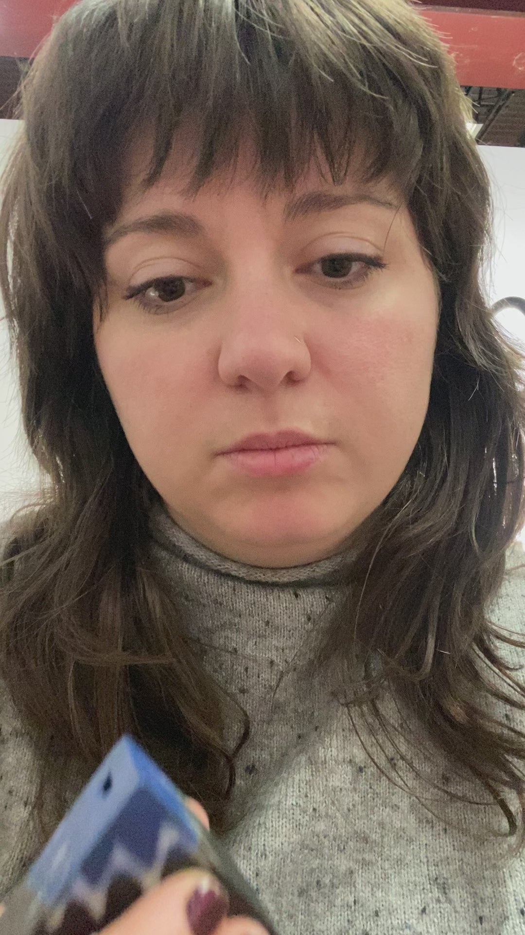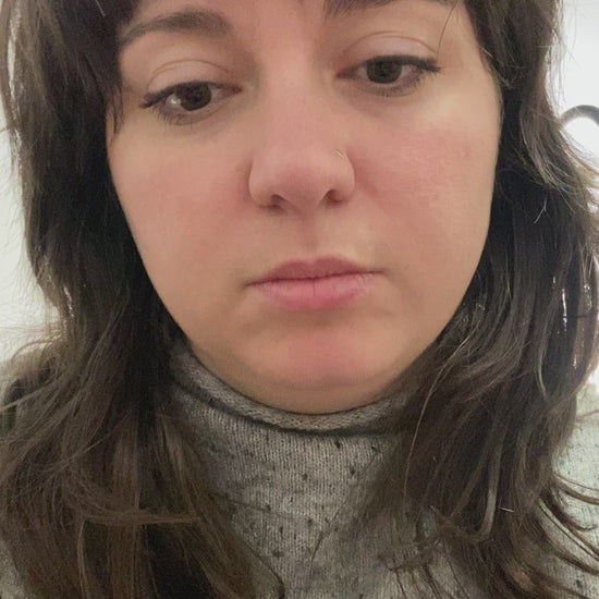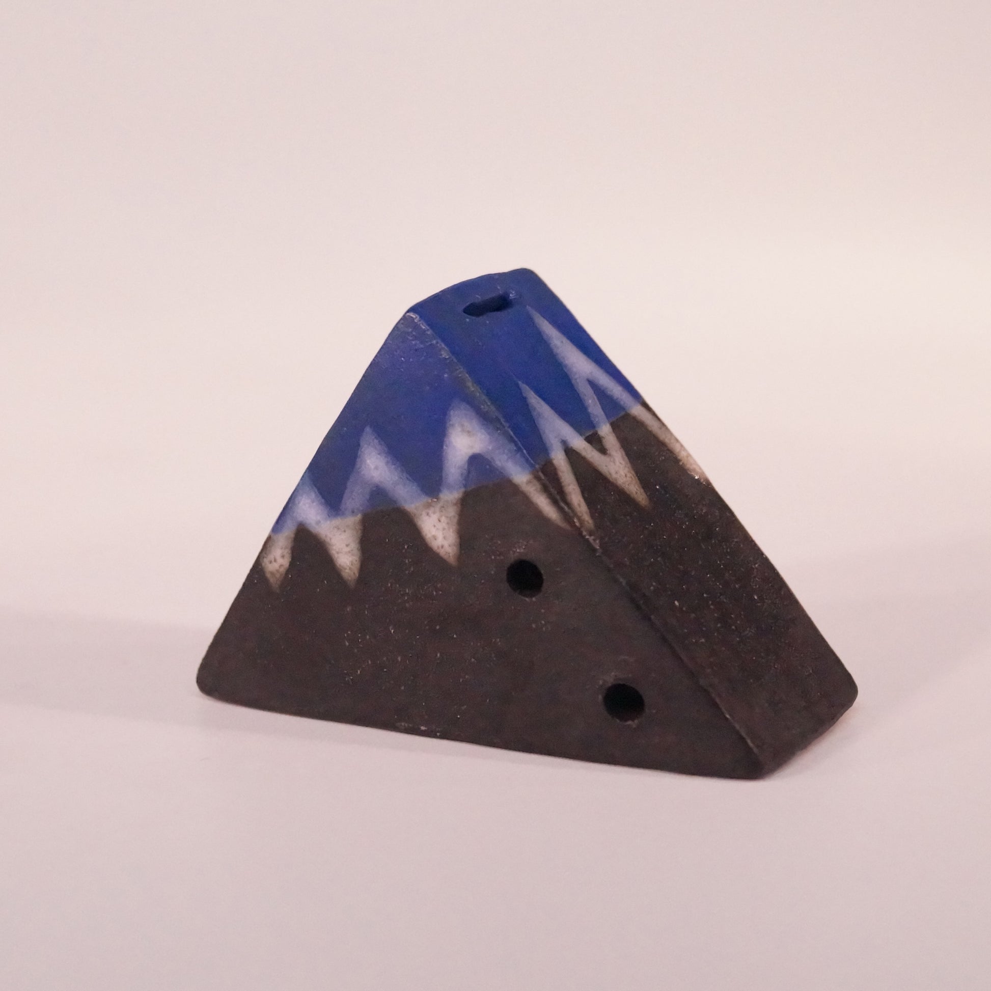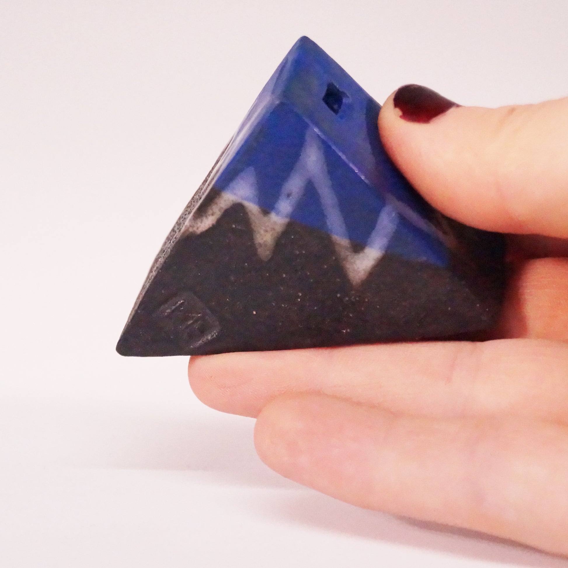 Triangle-shaped pocket-sized flute with black, blue, and a white zigzag design. Made of stoneware.