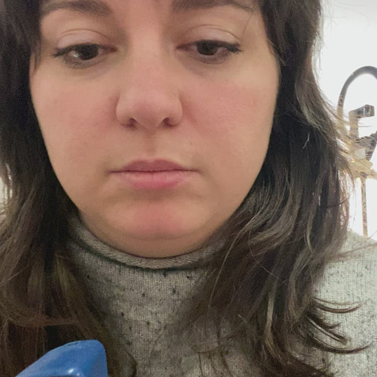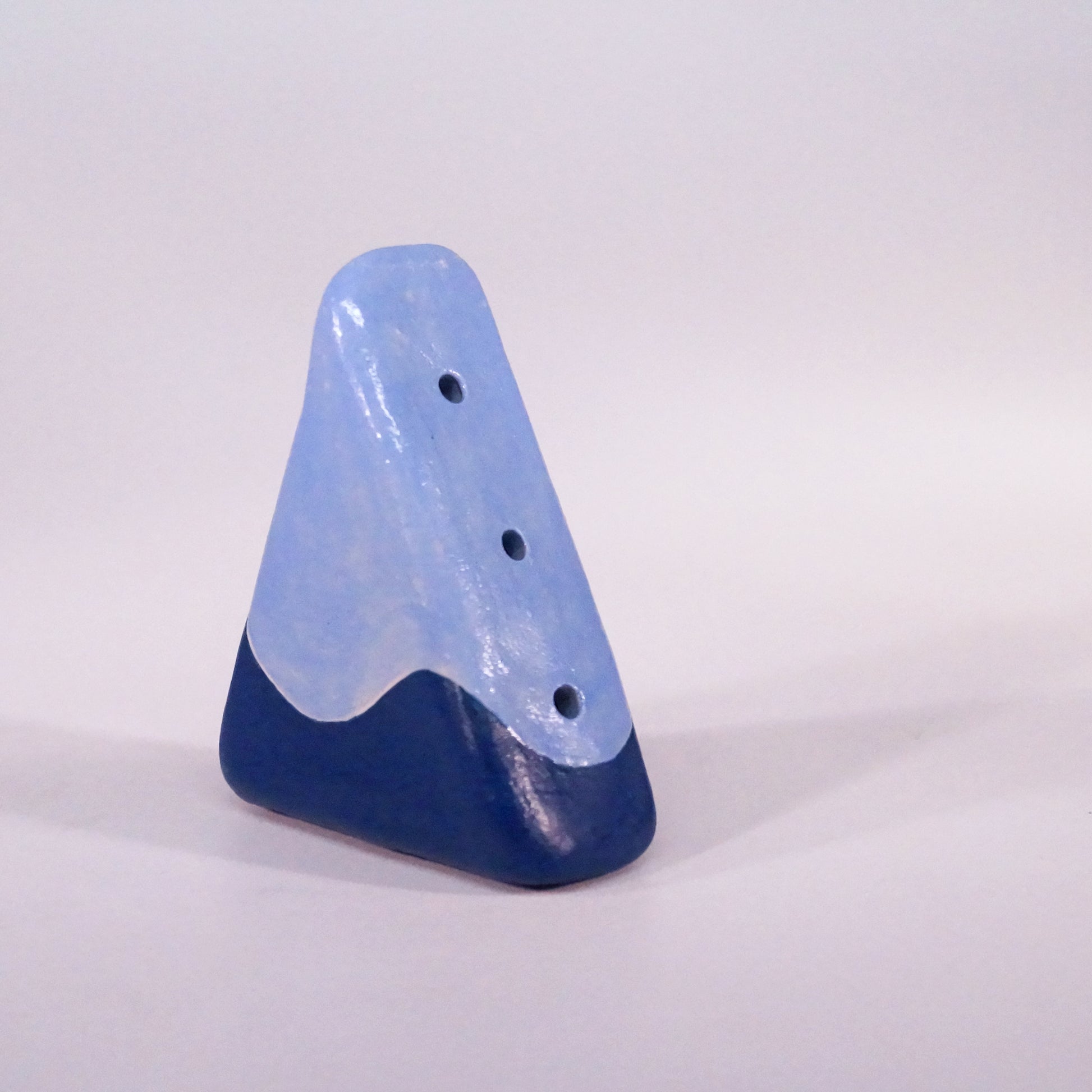 Triangle-shaped pocket-sized flute with light and dark blue. Made of stoneware.