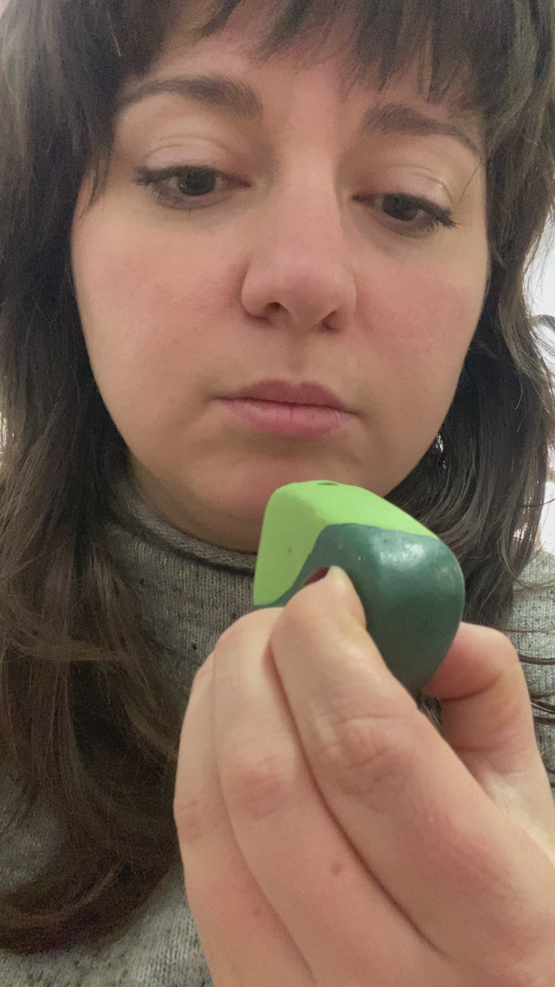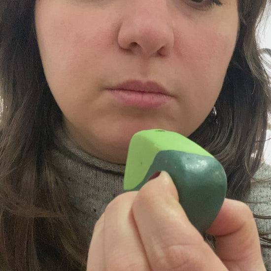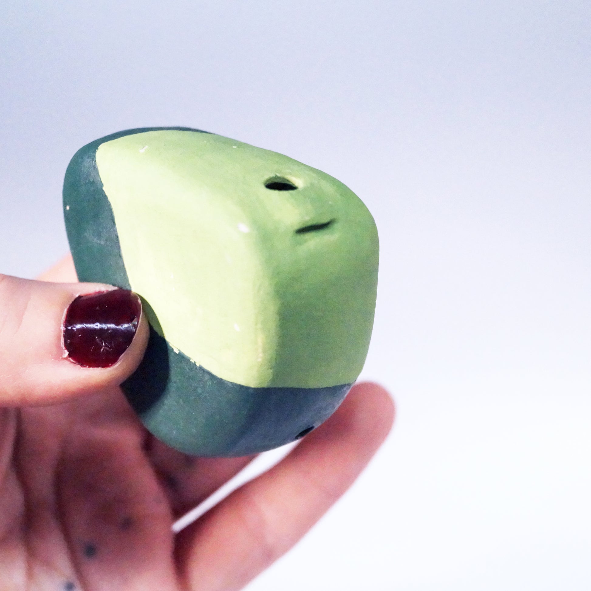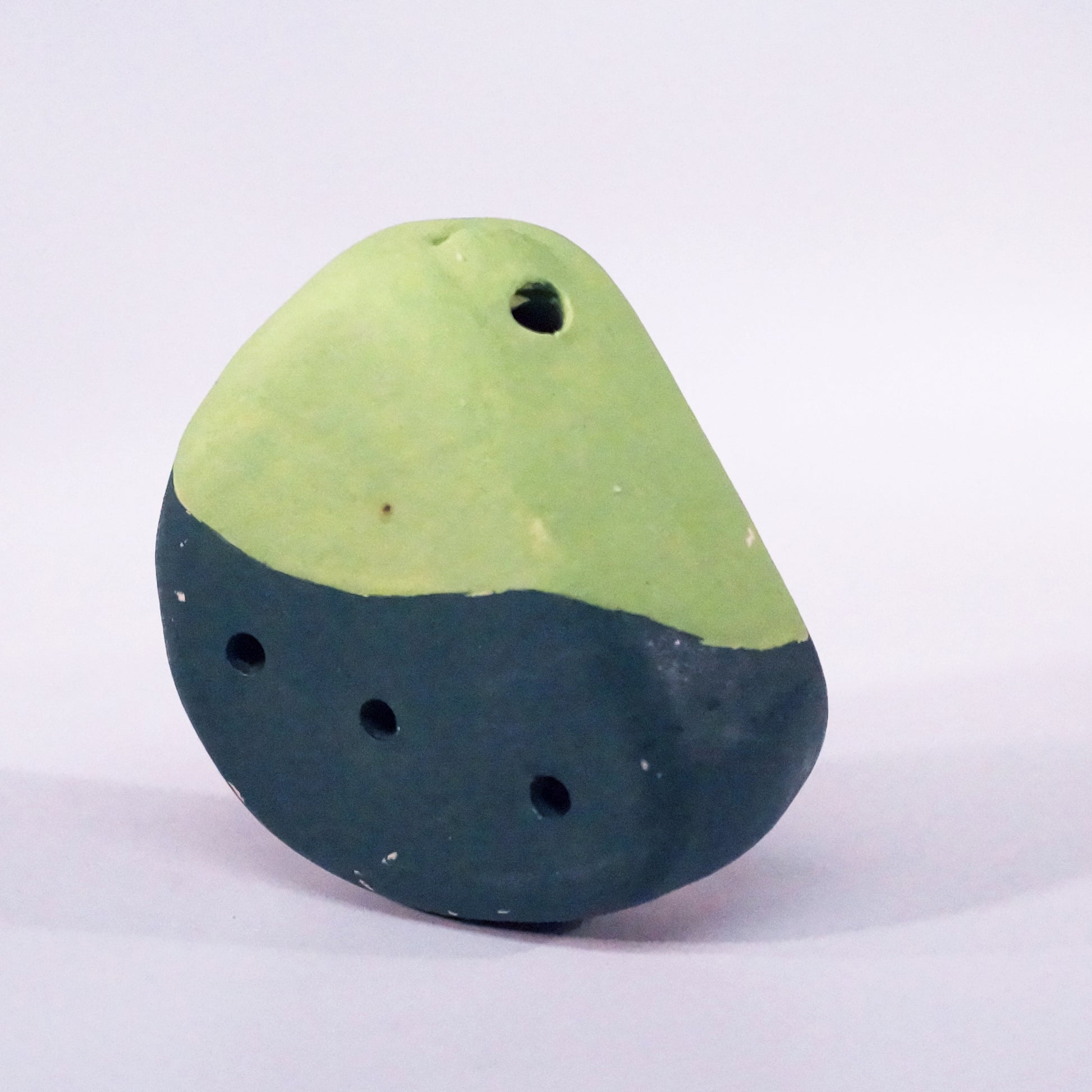 Arch-shaped pocket-sized flute with dark and light green. Made of stoneware.