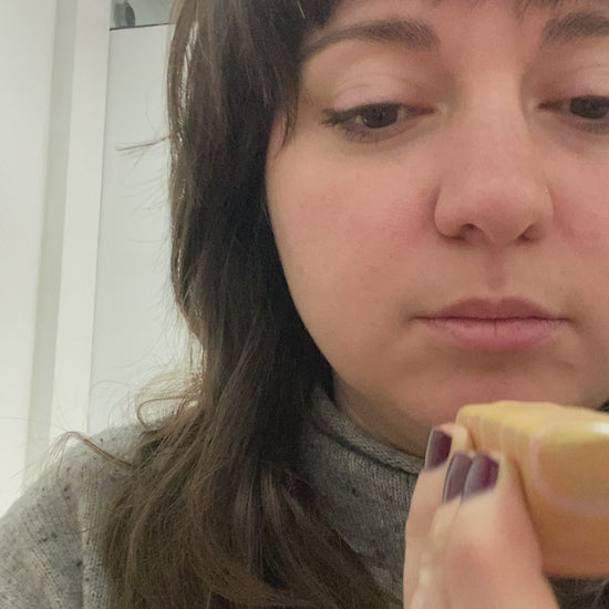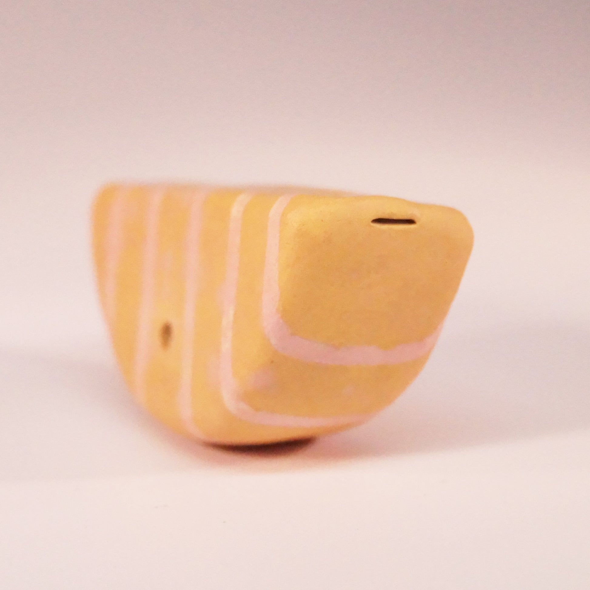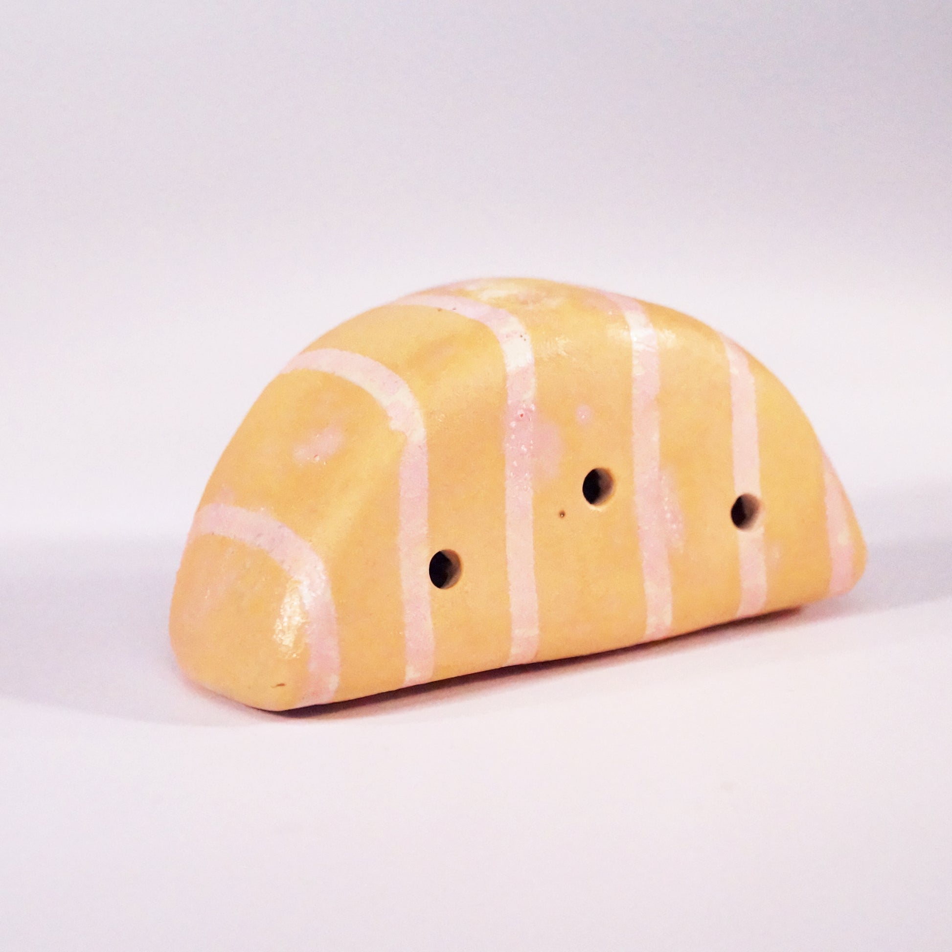 Semi-circular pocket-size flute with gold and pink stripes. Made of stoneware.