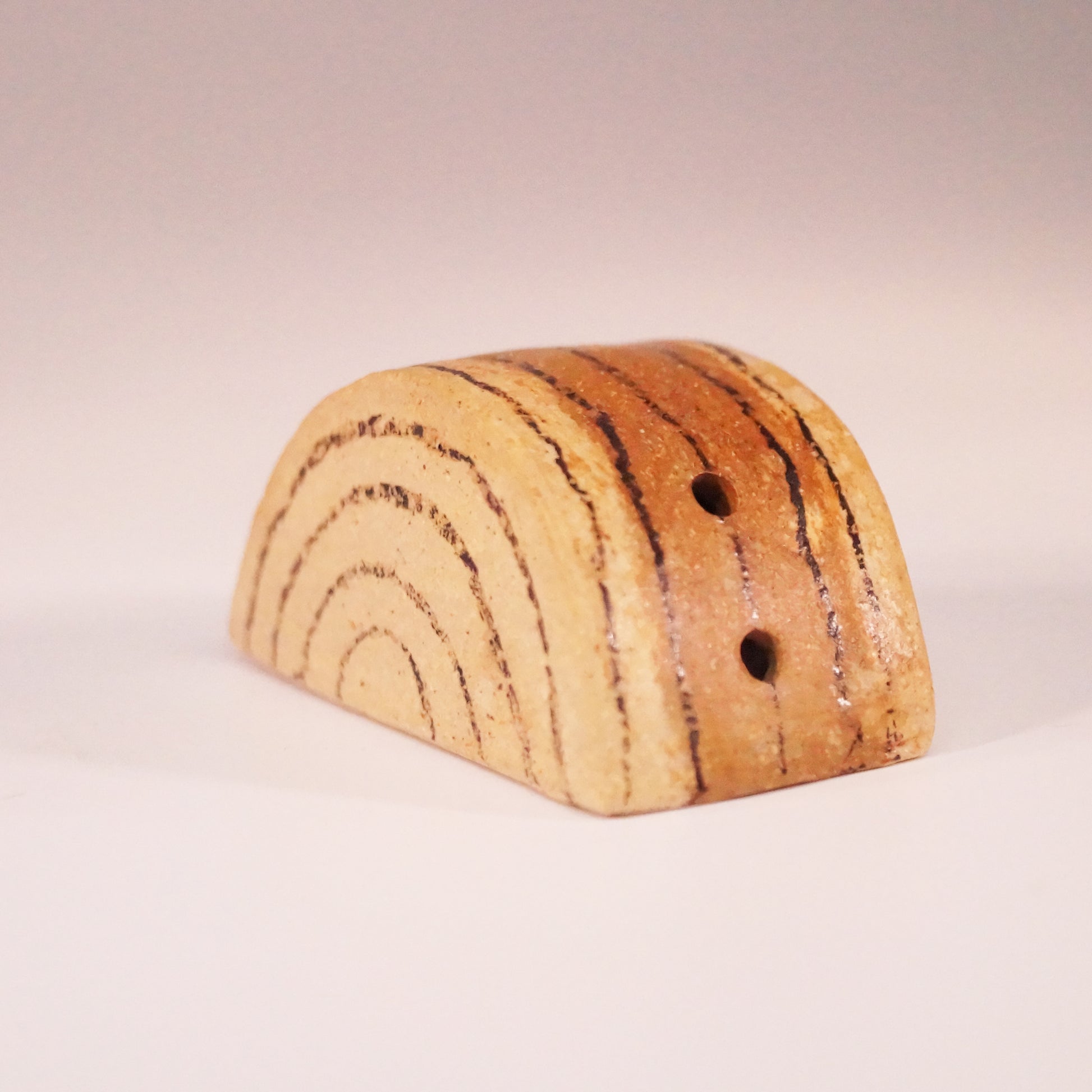 Semi-circular pocket-size flute with bare clay and drawn lines. Made of stoneware.