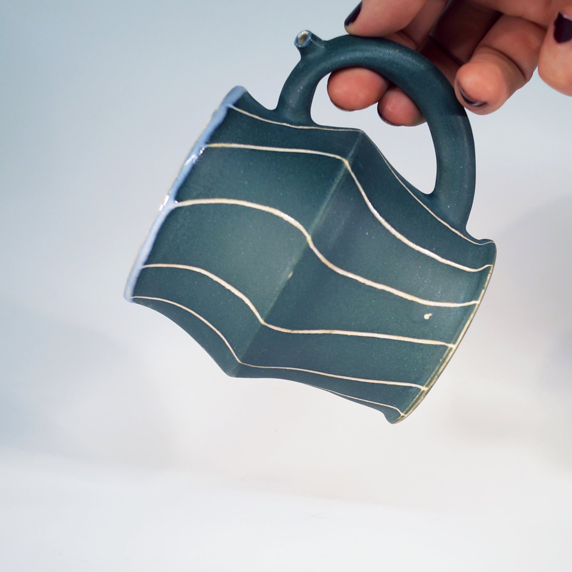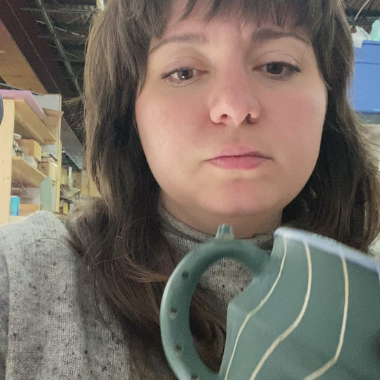 Flute Mug with 10oz capacity in Teal with Vertical Wave pattern. Porcelain with white-glazed interior.
