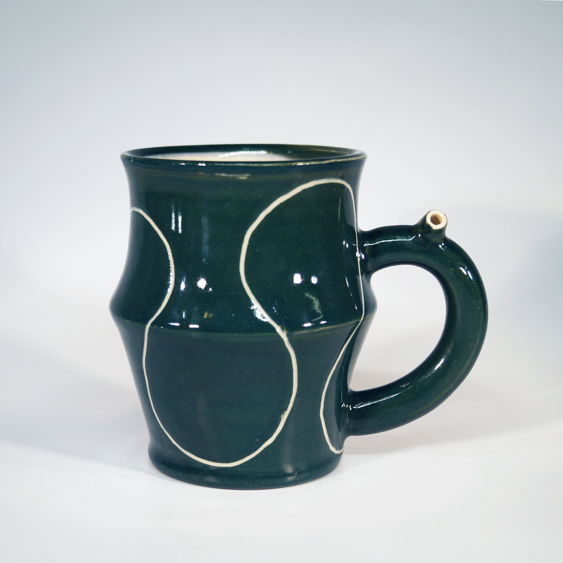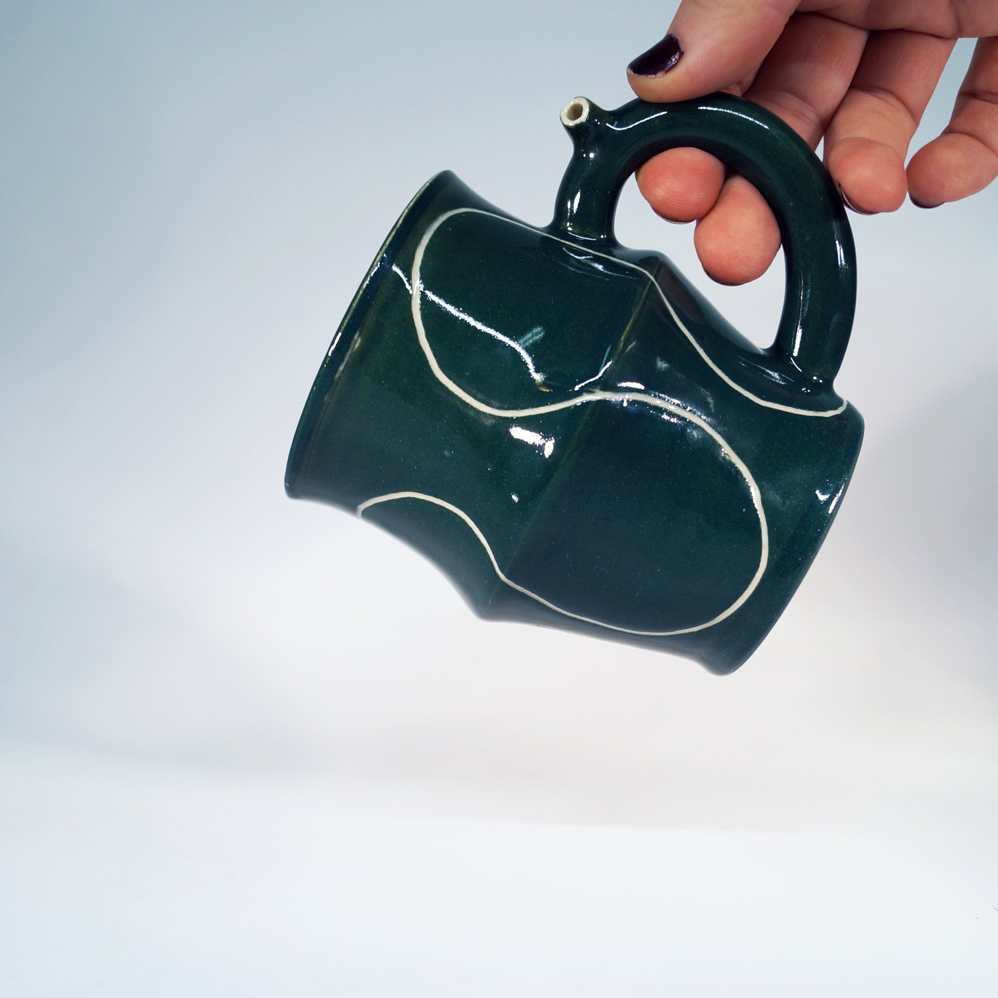 Flute Mug with 10oz capacity in Teal with Squiggle pattern. Porcelain with glossy clear glaze.