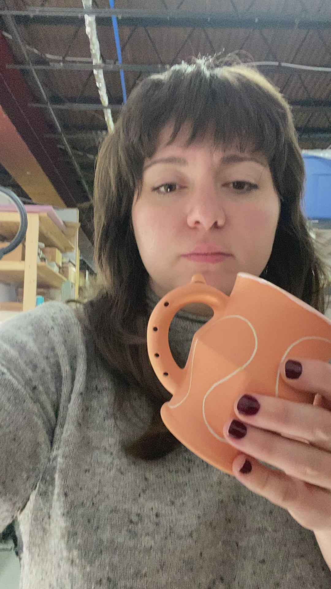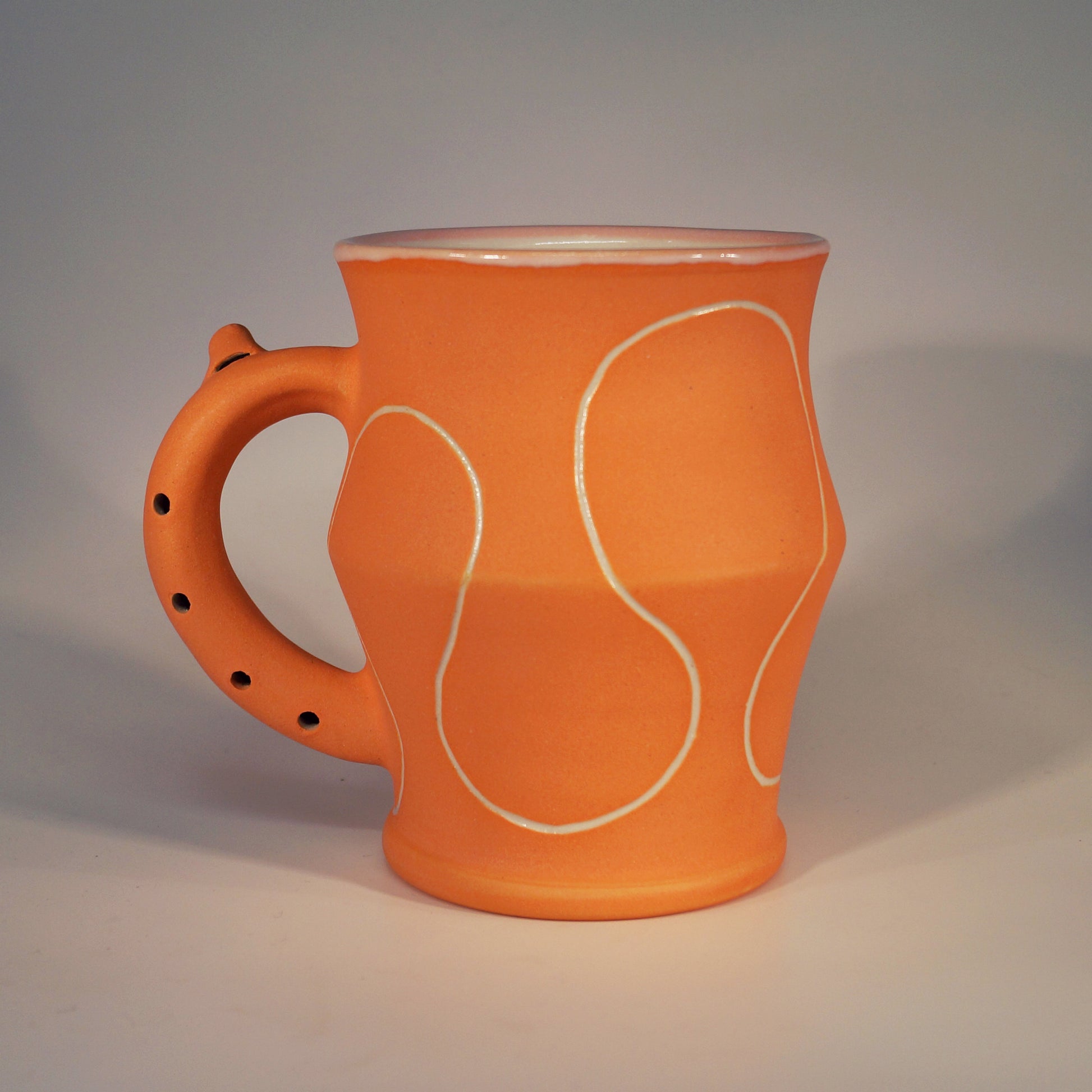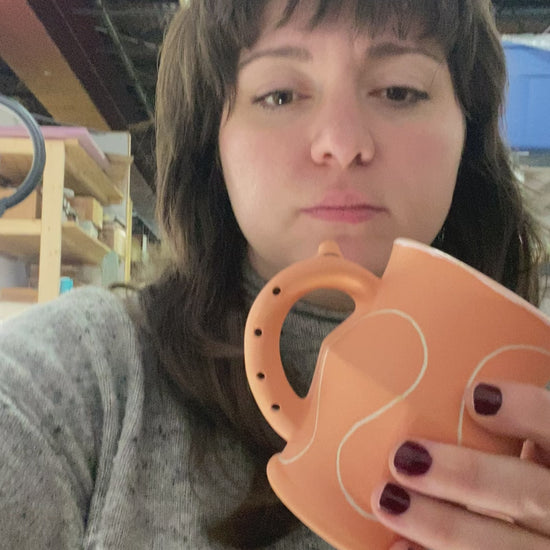 Flute Mug with 10oz capacity in Peach with Squiggle pattern. Porcelain with white-glazed interior.