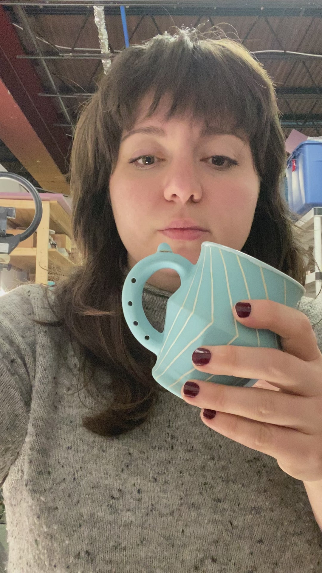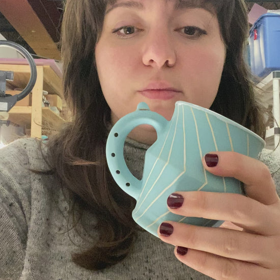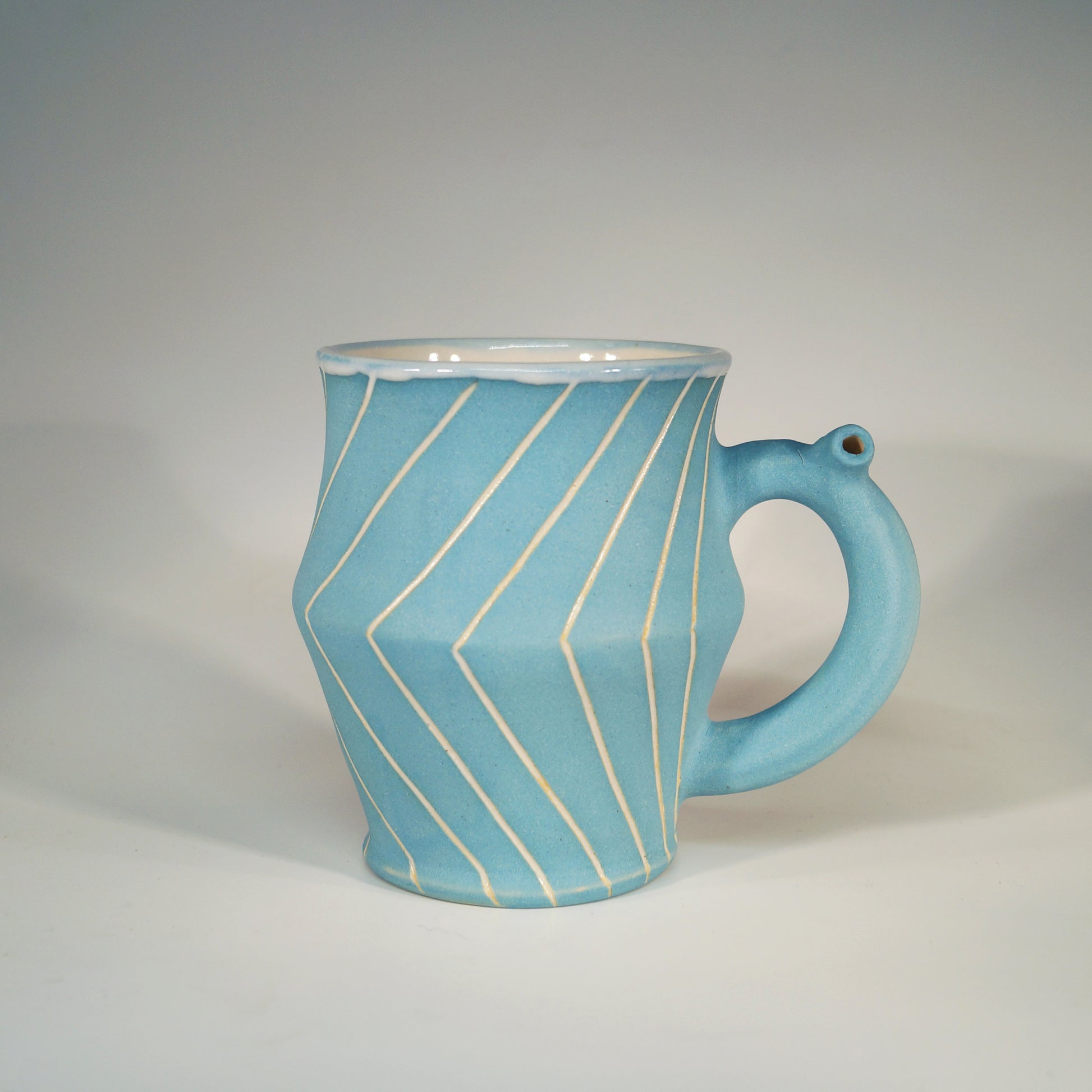 Flute Mug with 10oz capacity in Sky with Angles pattern. Porcelain with white-glazed interior.