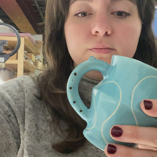 Flute Mug with 10oz capacity in Sky with Squiggle pattern. Porcelain with glossy clear glaze.
